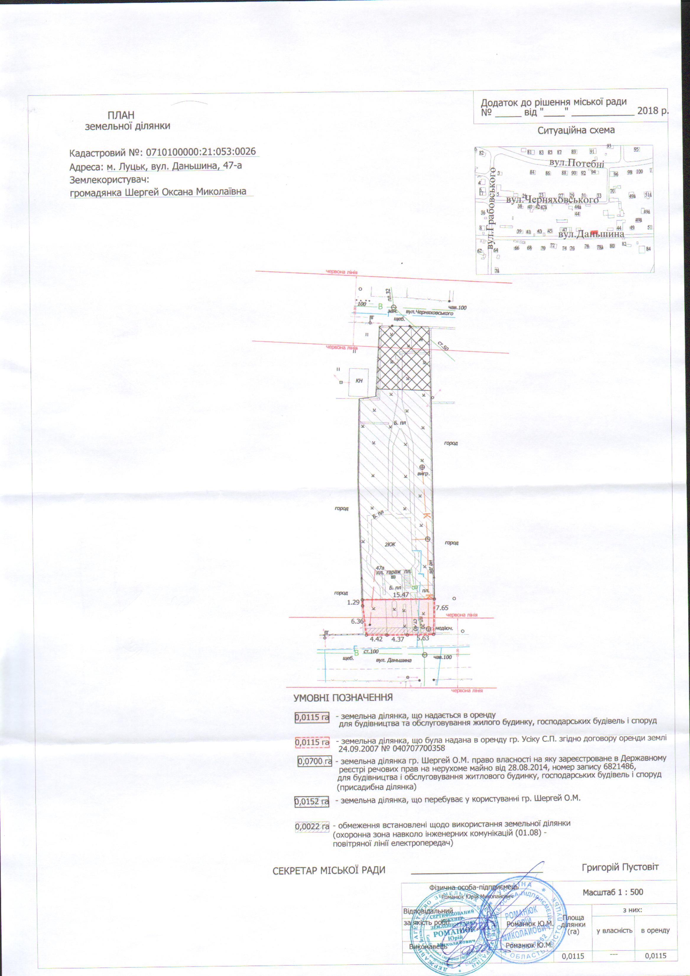 Розглянувши клопотання громадянки Шергей Оксани Миколаївни щодо надання на умовах оренди земельної ділянки на вул. Даньшина, 47-а для будівництва та обслуговування жилого будинку, господарських будівель і споруд, матеріали технічної документації із землеустрою щодо встановлення (відновлення) меж земельної ділянки в натурі (на місцевості) громадянці Шергей Оксані Миколаївні, витяг з Державного земельного кадастру про земельну ділянку від 17.05.2018 № НВ-0704098782018, керуючись статтями 12, 79-1, 93, 96, 116, 123-126, 186 Земельного кодексу України, статтею 55 Закону України «Про землеустрій», статтями 4-7, 16, 19 Закону України «Про оренду землі», статтями 21, 22, 24 Закону України «Про Державний земельний кадастр», статтею 4 Закону України «Про державну реєстрацію речових прав на нерухоме майно та їх обтяжень», Законом України «Про внесення змін до деяких законодавчих актів України щодо розмежування земель державної та комунальної власності», статтею 26 Закону України «Про місцеве самоврядування в Україні», пунктами 75, 107, 110-111 Постанови Кабінету Міністрів України від 17.10.2012 № 1051 «Про затвердження Порядку ведення Державного земельного кадастру», міська рада
