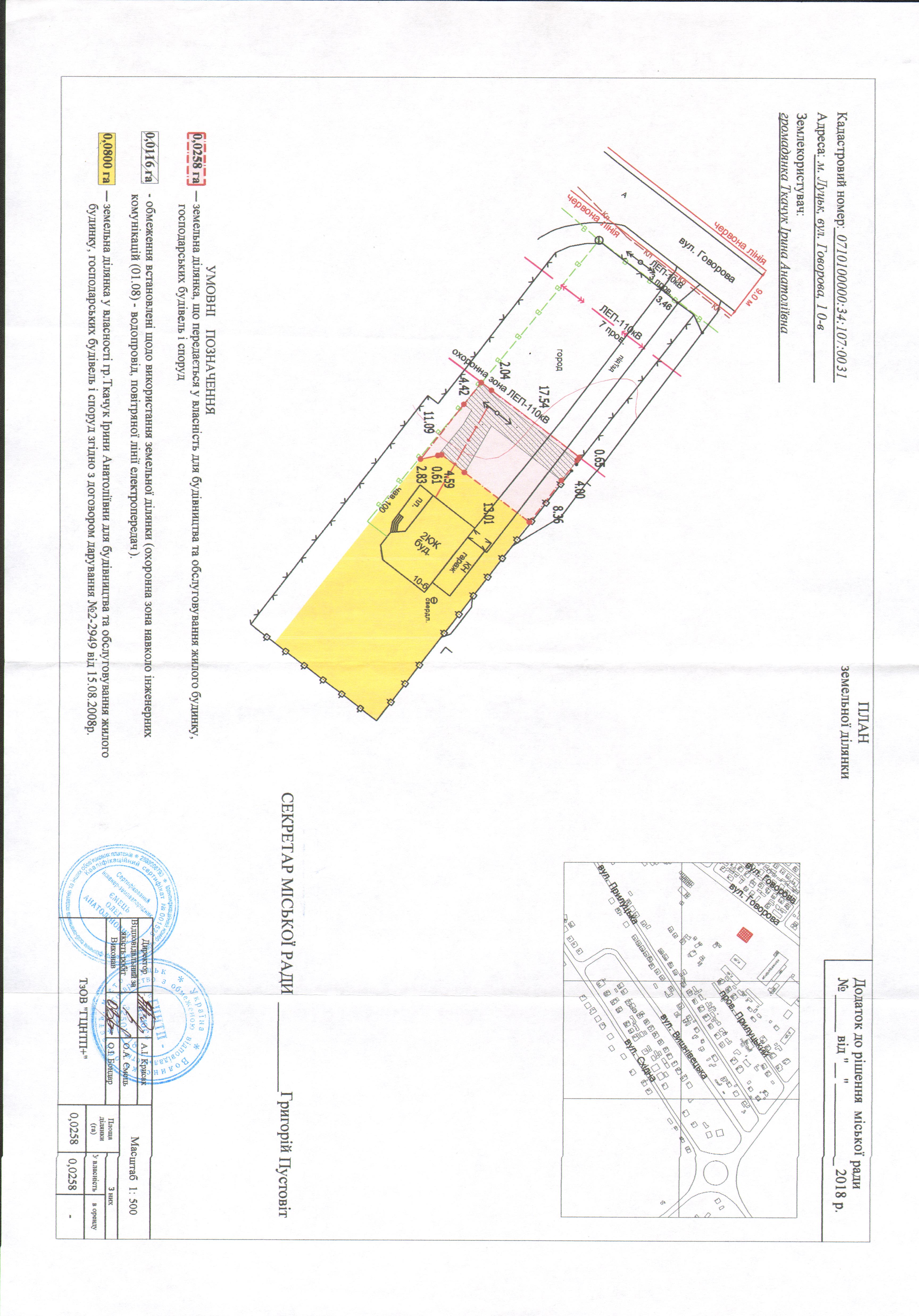 2. Надати громадянці Ткачук Ірині Анатоліївні у власність земельну ділянку на вул. Говорова, 10-в площею 0,0258 га, кадастровим номером 0710100000:34:107:0031 для будівництва та обслуговування жилого будинку, господарських будівель і споруд, згідно з додатком.
