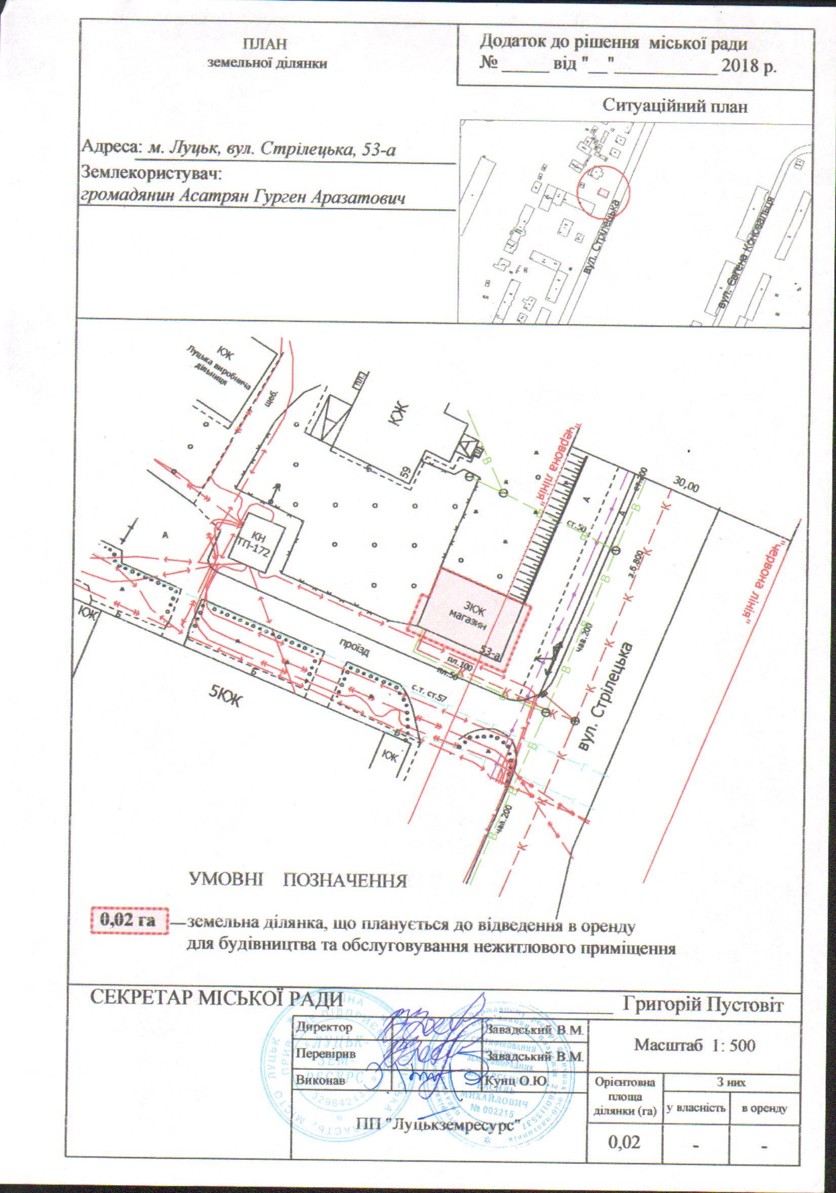 Розглянувши клопотання громадянина Асатряна Гургена Аразатовича про надання дозволу на розроблення проекту землеустрою щодо відведення земельної ділянки в оренду на вул. Стрілецькій, 53-а для будівництва та обслуговування нежитлового приміщення, схему генплану земельної ділянки з прикладеним листом управління містобудування та архітектури Луцької міської ради щодо режиму забудови даної території, визначеної для містобудівних потреб, встановлених у генеральному плані міста Луцька, враховуючи правовстановлюючі документи громадянина Асатряна Гургена Аразатовича на об’єкт нерухомого майна на вул. Стрілецькій, 53-а: договір купівлі-продажу нежитлового приміщення від 21.03.2005 № 578, відповідно до якого право власності на овочеву палатку зареєстровано 28.03.2005, реєстраційний номер: 10177298, технічний паспорт на об’єкт нерухомого майна від 14.04.2008, керуючись статтями 12, 79-1, 93, 123 Земельного кодексу України, статтею 6 Закону України «Про оренду землі», статтею 50 Закону України «Про землеустрій», Законом України «Про регулювання містобудівної діяльності», Законом України «Про внесення змін до деяких законодавчих актів України щодо розмежування земель державної та комунальної власності», статтею 26 Закону України «Про місцеве самоврядування в Україні», міська рада