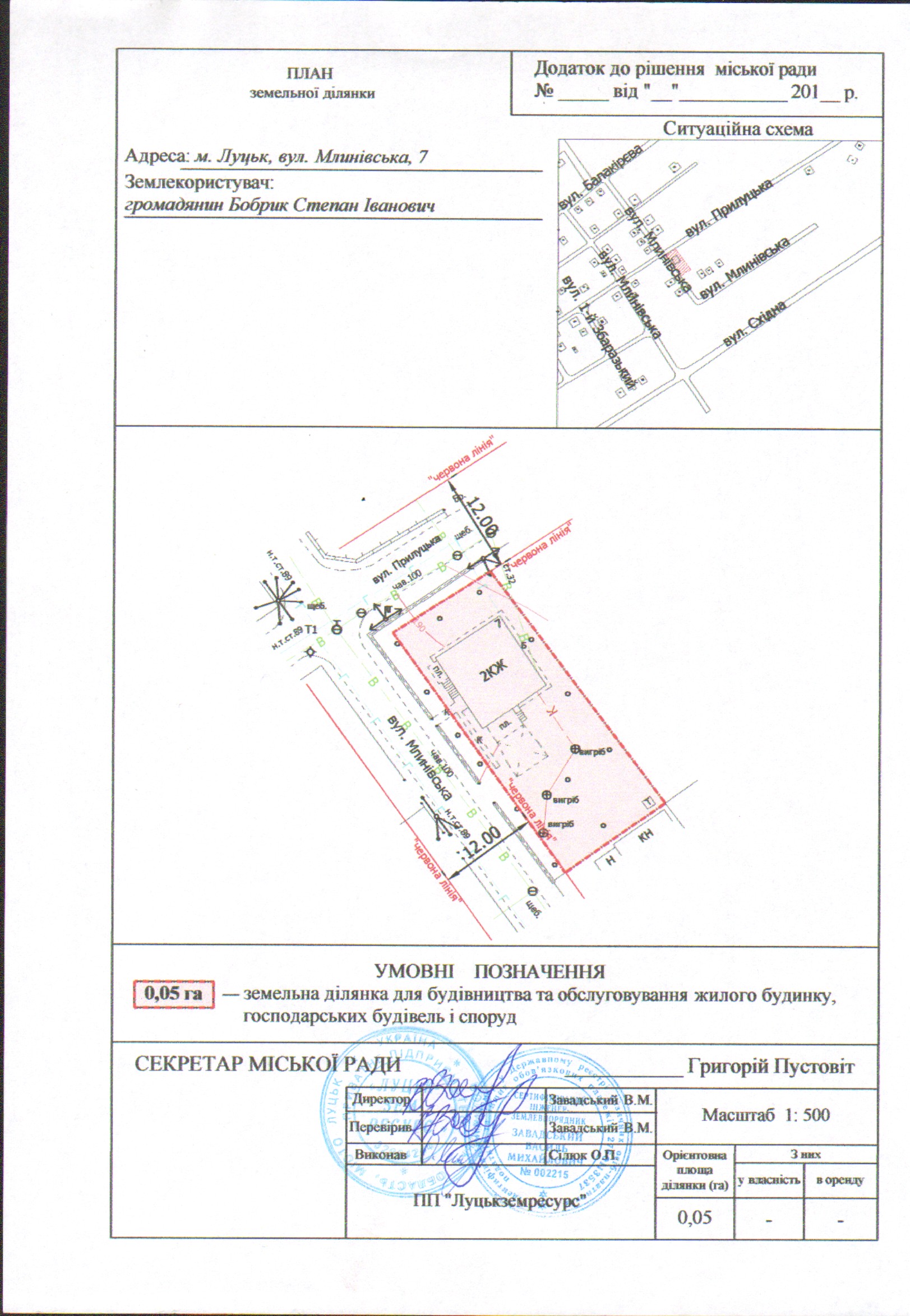 Розглянувши заяву громадянина Бобрика Степана Івановича про надання дозволу на розроблення технічної документації із землеустрою щодо встановлення (відновлення) меж земельної ділянки в натурі (на місцевості) на вул. Млинівській, 7, виписку з рішення виконавчого комітету Луцької міської Ради народних депутатів, акт про відведення земельної ділянки для будівництва індивідуального жилого будинку, проект забудови індивідуальної садиби, рішення Луцької міської ради від 10.09.2008 №30/198 «Про перейменування вулиць міста Луцька», рішення виконавчого комітету Луцької міської ради від 25.11.2008 №820-1 «Про зміну нумерації будівель у зв’язку з перейменуванням вулиць», керуючись статтями 12, 79-1, 96, 116, 118, 120, 121 Земельного кодексу України, Законом України «Про внесення змін до деяких законодавчих актів України щодо розмежування земель державної та комунальної власності», Законом України «Про землеустрій», Законом України «Про Державний земельний кадастр», Постановою Кабінету Міністрів України від 17.10.2012 № 1051 «Про затвердження Порядку ведення Державного земельного кадастру», ст. 26 Закону України «Про місцеве самоврядування в Україні», Генеральним планом міста Луцька, затвердженим рішенням міської ради від 24.06.2009 № 42/1 «Про затвердження Генерального плану міста», планом зонування міста Луцька, затвердженим рішенням міської ради від 31.03.2014 № 57/30 «Про затвердження плану зонування території міста Луцька», міська рада