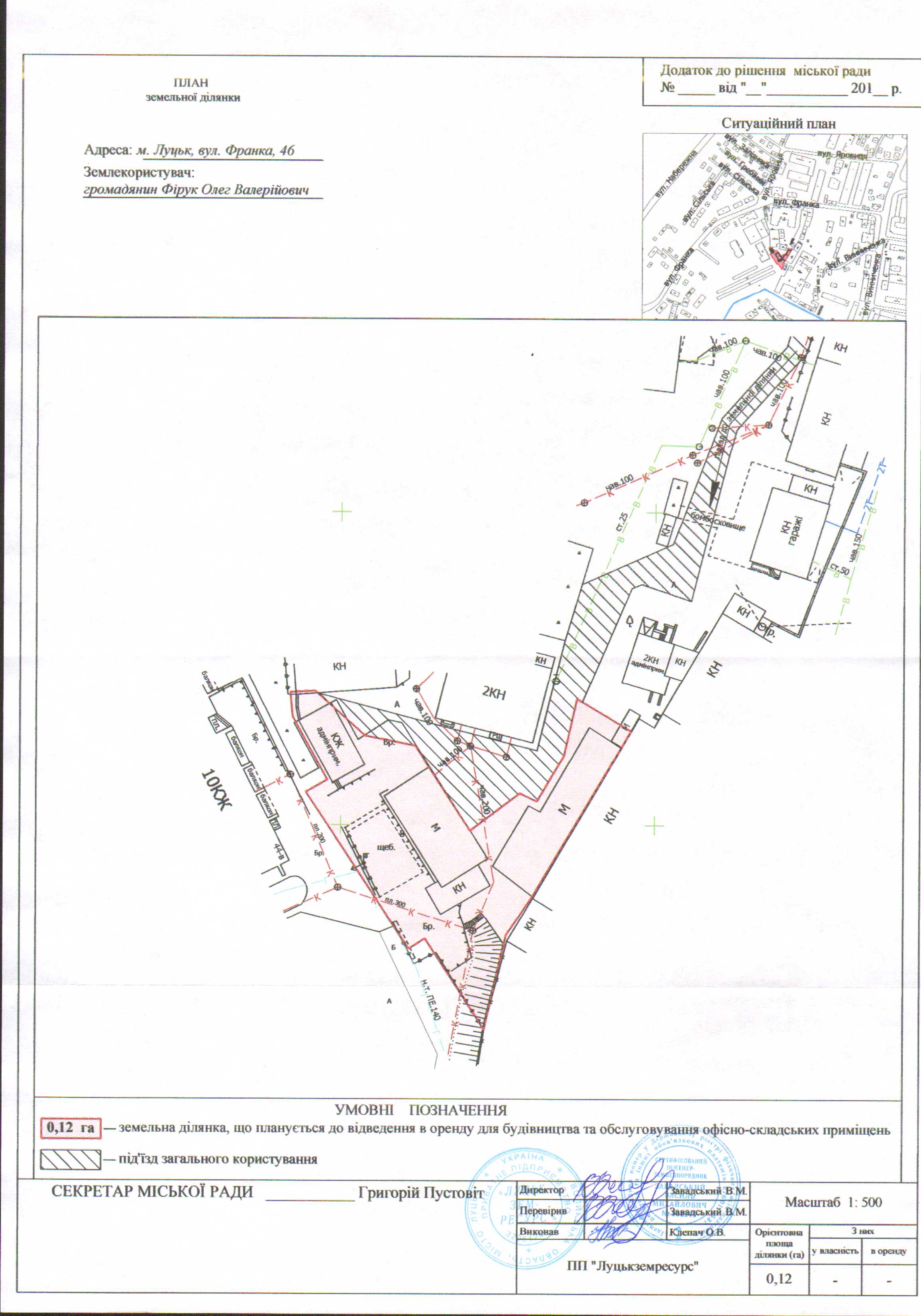 Розглянувши клопотання громадянина Фірука Олега Валерійовича про надання дозволу на розроблення проекту землеустрою щодо відведення земельної ділянки в оренду на вул. Франка, 46 для будівництва та обслуговування офісно-складських приміщень, схему генплану земельної ділянки з прикладеним листом управління містобудування та архітектури Луцької міської ради щодо режиму забудови даної території, визначеної для містобудівних потреб, встановлених у генеральному плані міста Луцька, враховуючи правовстановлюючі документи громадянина Фірука Олега Валерійовича на об’єкти нерухомого майна на вул. Франка, 46: договір купівлі-продажу від 11.04.2012 № 1224, відповідно до якого право власності на складські приміщення Є-1 зареєстроване 19.04.2012, реєстраційний номер: 5924178, технічний паспорт на об’єкт нерухомого майна від 18.04.2012; договір купівлі-продажу від 11.04.2012 № 1226, відповідно до якого право власності на складські приміщення З-1 зареєстроване 19.04.2012, реєстраційний номер: 5923030, технічний паспорт на об’єкт нерухомого майна від 10.10.2017; договір купівлі-продажу від 11.04.2012 № 1222, відповідно до якого право власності на складські приміщення Ж-1 зареєстроване 19.04.2012, реєстраційний номер: 5923404, технічний паспорт на об’єкт нерухомого майна від 10.10.2017, керуючись статтями 12, 93, 96, 123 Земельного кодексу України, статтею 7 Закону України «Про оренду землі», статтею 50 Закону України «Про землеустрій», Законом України «Про регулювання містобудівної діяльності», Законом України «Про внесення змін до деяких законодавчих актів України щодо розмежування земель державної та комунальної власності», статтею 26 Закону України «Про місцеве самоврядування в Україні», міська рада
