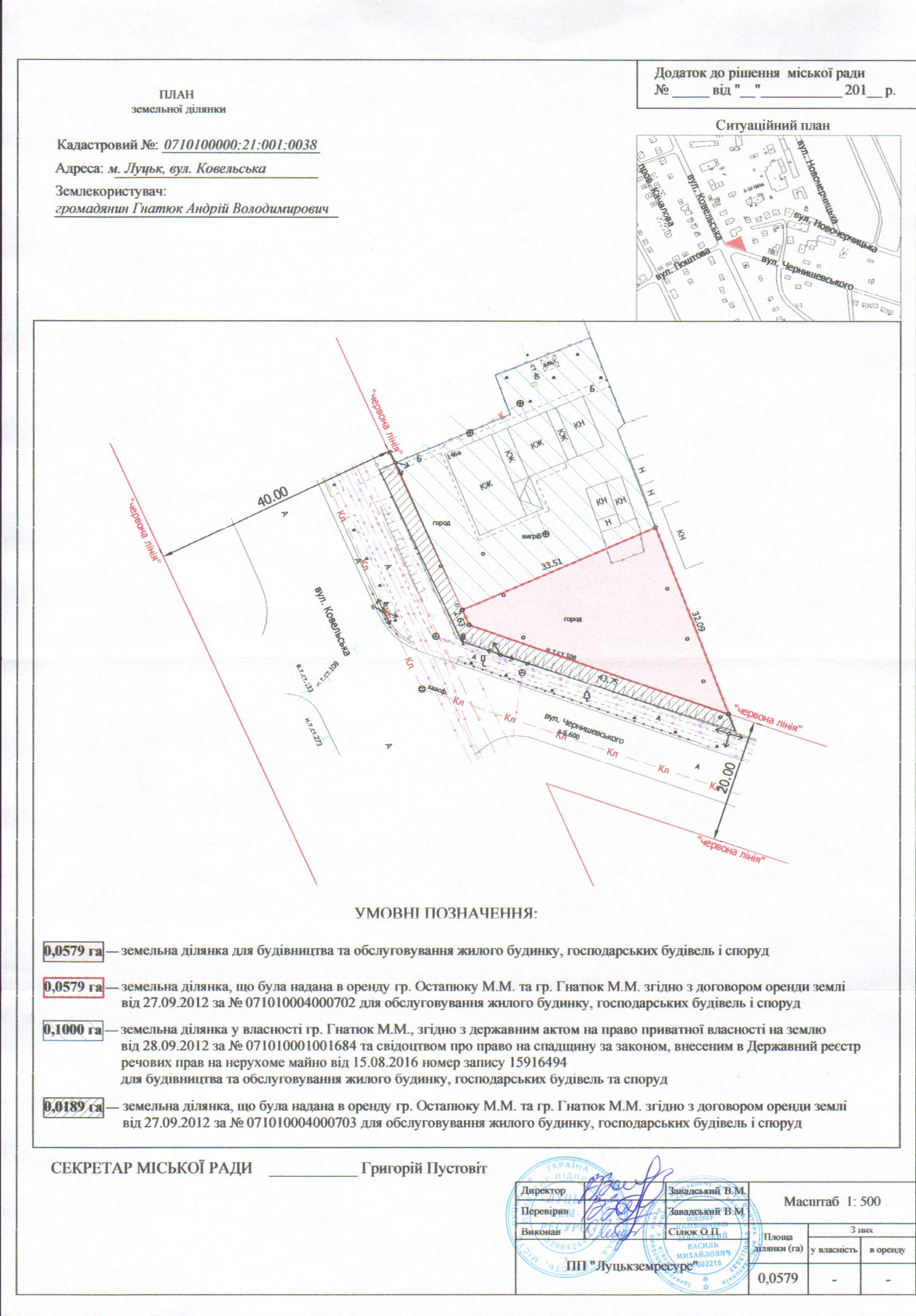 Розглянувши заяву громадянина Гнатюка Андрія Володимировича (учасника АТО) про надання дозволу на розроблення технічної документації із землеустрою щодо встановлення (відновлення) меж земельної ділянки в натурі (на місцевості) на вул. Ковельській, згоду матері Гнатюк Марії Миколаївни на вилучення земельної ділянки з її користування, договір оренди землі, зареєстрований у Державному реєстрі земель від 27.09.2012 за №071010004000702, акт приймання-передачі земельної ділянки від 03.10.2017, генплан земельної ділянки, лист управління містобудування та архітектури Луцької міської ради щодо режиму забудови даної території, визначеної для містобудівних потреб генеральним планом м. Луцька, витяг з Державного земельного кадастру про земельну ділянку та посвідчення серія АА № 223274, керуючись статтями 12, 79-1, 96, 116, 118, 120, 121 Земельного кодексу України, Законом України «Про внесення змін до деяких законодавчих актів України щодо розмежування земель державної та комунальної власності», Законом України «Про землеустрій», Законом України «Про Державний земельний кадастр», Постановою Кабінету Міністрів України від 17.10.2012 № 1051 «Про затвердження Порядку ведення Державного земельного кадастру», ст. 26 Закону України «Про місцеве самоврядування в Україні», Генеральним планом міста Луцька, затвердженим рішенням міської ради від 24.06.2009 № 42/1 «Про затвердження Генерального плану міста», планом зонування міста Луцька, затвердженим рішенням міської ради від 31.03.2014 № 57/30 «Про затвердження плану зонування території міста Луцька», міська рада
