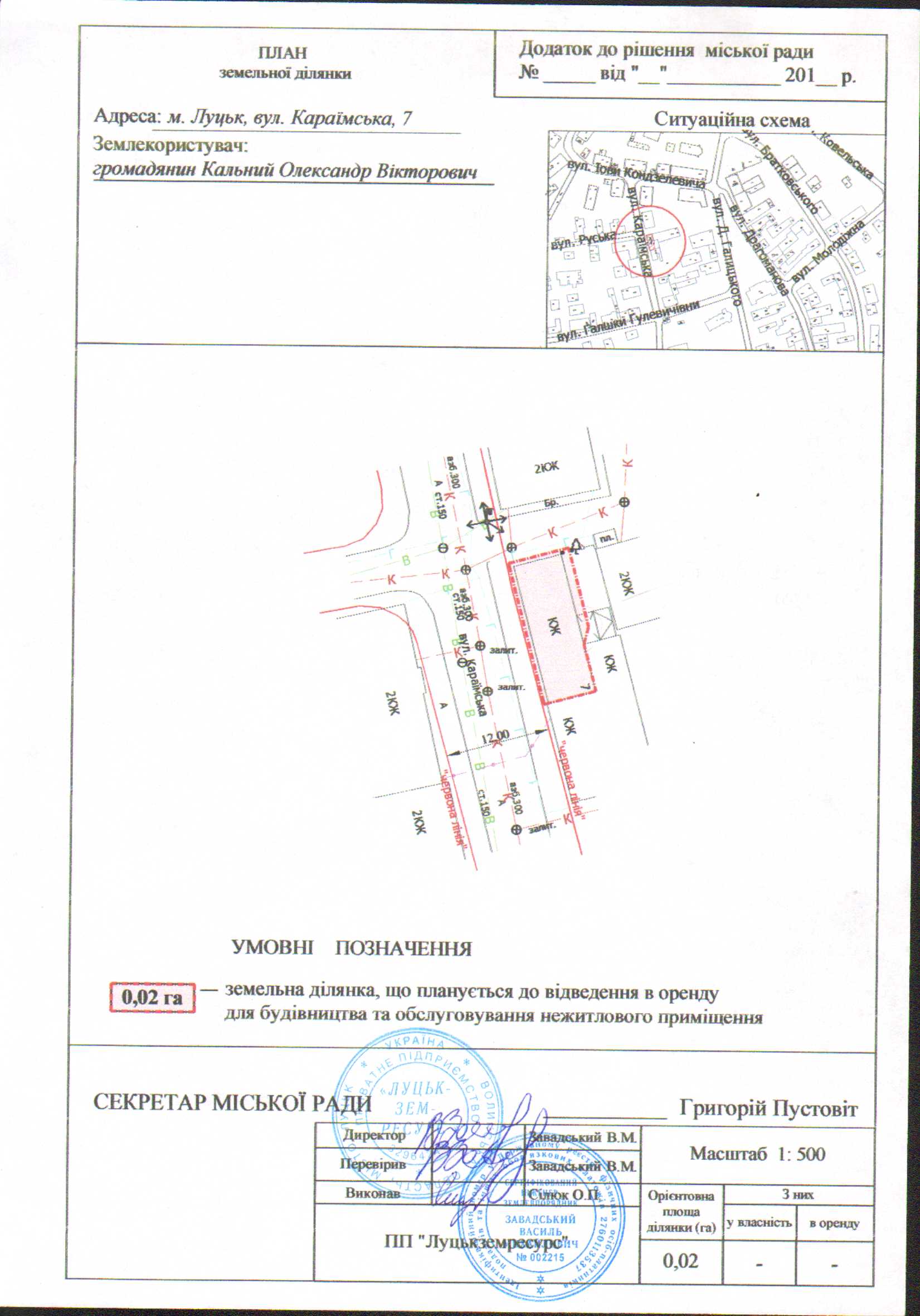 1. Надати громадянину Кальному Олександру Вікторовичу дозвіл на розроблення проекту землеустрою щодо відведення земельної ділянки на умовах оренди для будівництва та обслуговування нежитлового приміщення на вул. Караїмській, 7, орієнтовною площею 0,02 га, з земель комунальної власності, згідно з додатком.