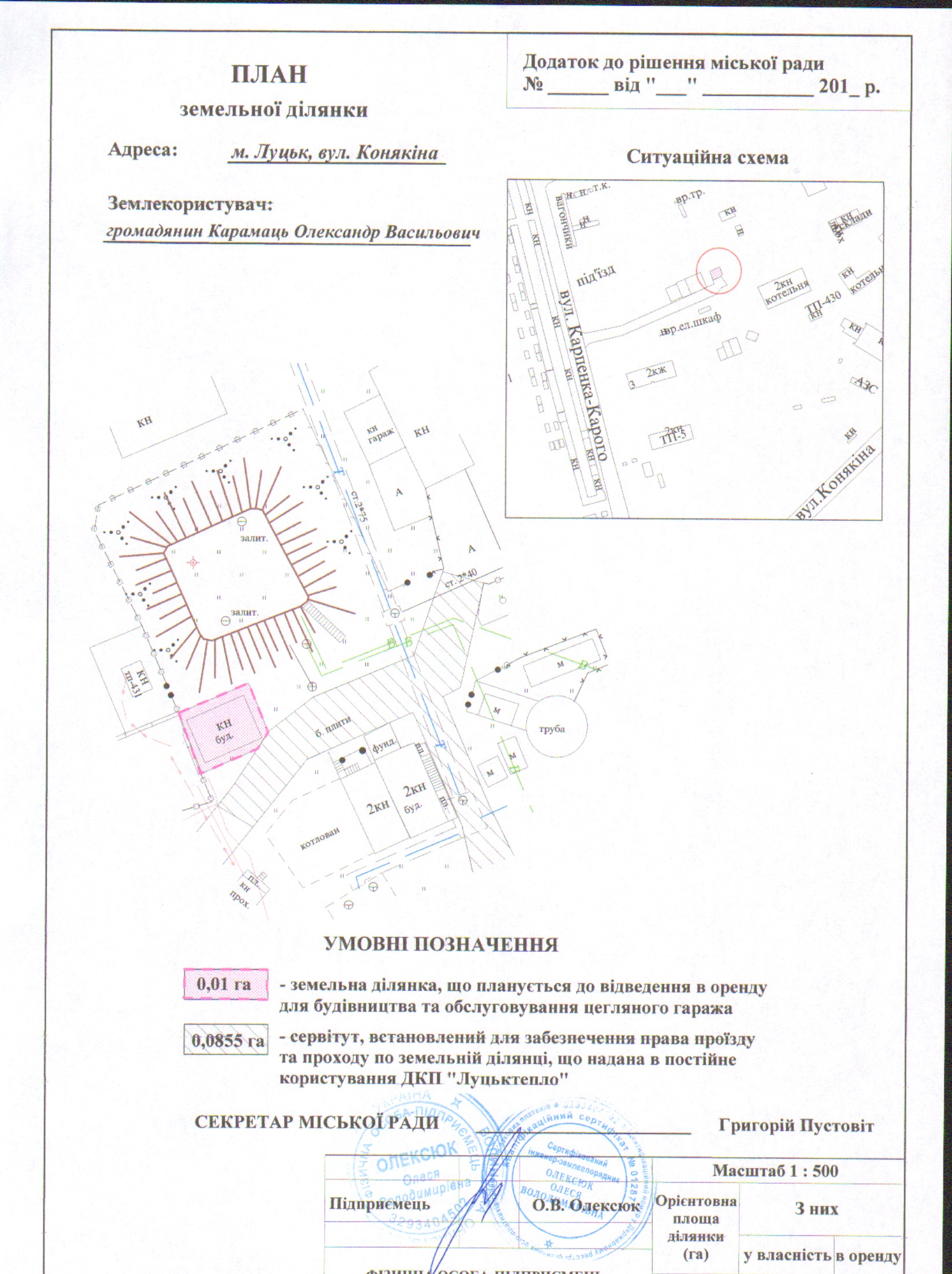 Розглянувши клопотання громадянина Карамаць Олександра Васильовича про надання дозволу на розроблення проекту землеустрою щодо відведення земельної ділянки на вул. Конякіна для будівництва та обслуговування цегляного гаража, схему генплану земельної ділянки з прикладеним листом управління містобудування та архітектури Луцької міської ради щодо режиму забудови даної території, визначеної для містобудівних потреб, встановлених у генеральному плані міста Луцька, враховуючи рішення виконавчого комітету Луцької міської ради від 24.07.2008 № 504-49 «Про дозвіл на будівництво», будівельний паспорт на забудову земельної ділянки від 05.08.2008, реєстраційний № 206, технічний паспорт на об’єкт нерухомого майна від 17.11.2010, враховуючи витяг з протоколу пленарного засідання тридцять шостої сесії міської ради сьомого скликання від 22.12.2017, керуючись статтями 12, 79-1, 93, 123 Земельного кодексу України, статтею 6 Закону України «Про оренду землі», статтею 50 Закону України «Про землеустрій», Законом України «Про внесення змін до деяких законодавчих актів України щодо розмежування земель державної та комунальної власності», статтею 26 Закону України “Про місцеве самоврядування в Україні”, Законом України «Про регулювання містобудівної діяльності», міська рада