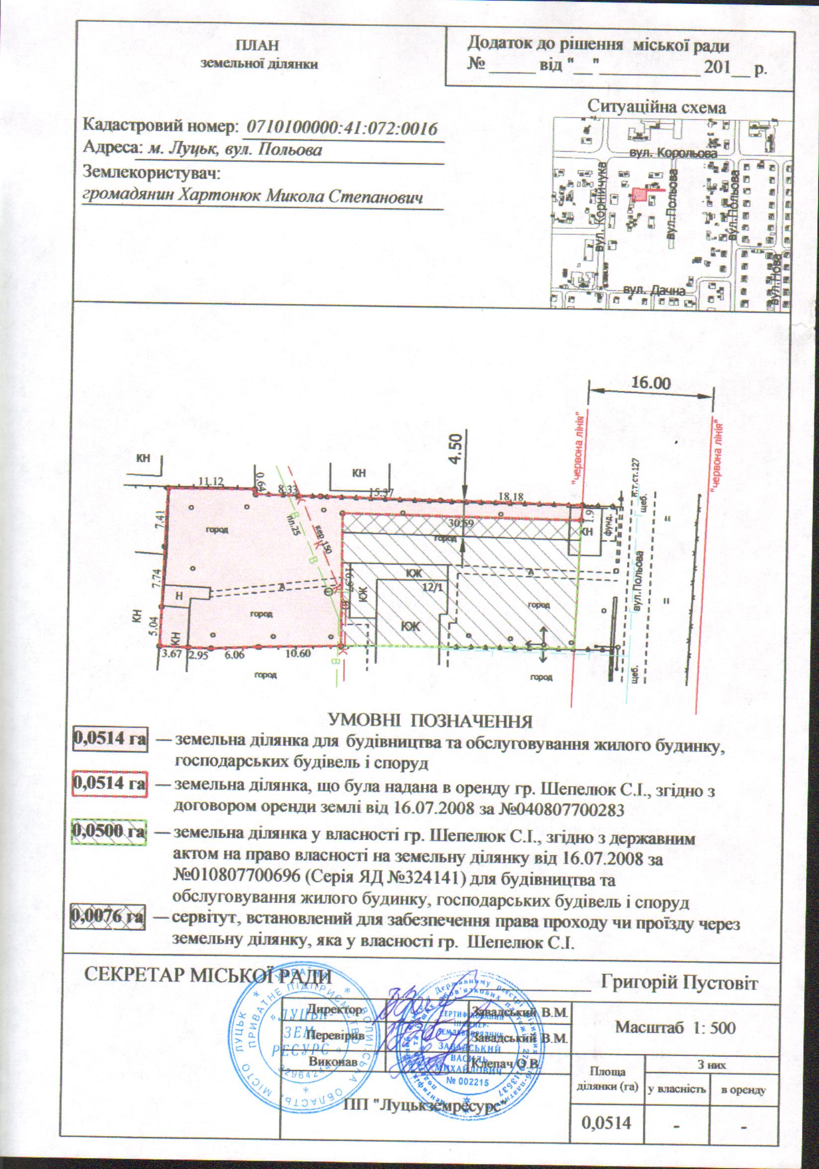 Розглянувши заяву громадянина Хартонюка Миколи Степановича про надання дозволу на розроблення технічної документації із землеустрою щодо встановлення (відновлення) меж земельної ділянки в натурі (на місцевості) на вул. Польовій, нотаріальні згоди Шепелюк Світлани Іллівни на вилучення земельної ділянки з її користування, на знесення господарських будівель розташованих на земельній ділянці, а також на проїзд через земельну ділянку, що перебуває у її власності, договір оренди землі, зареєстрований у Державному реєстрі земель від 16.07.2008 за №040807700283, акт приймання-передачі земельної ділянки, генплан земельної ділянки, лист управління містобудування та архітектури Луцької міської ради щодо режиму забудови даної території, визначеної для містобудівних потреб генеральним планом м. Луцька, витяг з Державного земельного кадастру про земельну ділянку та довідку з управління Держгеокадастру у Луцькому районі Волинської області, керуючись статтями 12, 79-1, 96, 116, 118, 120, 121 Земельного кодексу України, Законом України «Про внесення змін до деяких законодавчих актів України щодо розмежування земель державної та комунальної власності», Законом України «Про землеустрій», Законом України «Про Державний земельний кадастр», Постановою Кабінету Міністрів України від 17.10.2012 № 1051 «Про затвердження Порядку ведення Державного земельного кадастру», ст. 26 Закону України «Про місцеве самоврядування в Україні», Генеральним планом міста Луцька, затвердженим рішенням міської ради від 24.06.2009 № 42/1 «Про затвердження Генерального плану міста», планом зонування міста Луцька, затвердженим рішенням міської ради від 25.02.2015 № 71/13 «Про затвердження плану зонування території міста Луцька», міська рада