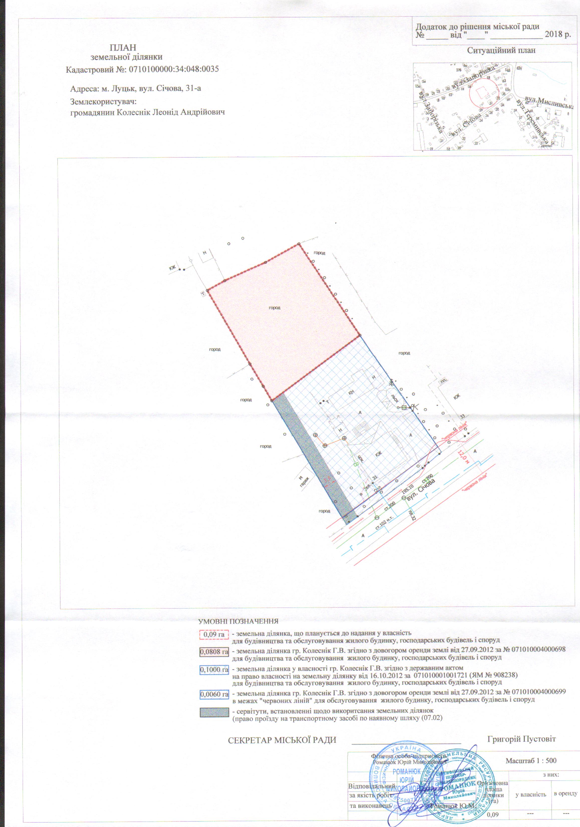 Розглянувши заяву громадянина Колесніка Леоніда Андрійовича про надання дозволу на розроблення технічної документації із землеустрою щодо встановлення (відновлення) меж земельної ділянки в натурі (на місцевості) на вул. Січовій, 31-а, нотаріальну згоду матері Колеснік Галини Василівни на вилучення земельної ділянки з її користування, а також на проїзд через земельну ділянку, що перебуває у її власності, договір оренди землі, зареєстрований у Державному реєстрі земель від 27.09.2012 за №071010004000698, акт приймання-передачі земельної ділянки від 13.11.2017, схему генплану земельної ділянки, лист управління містобудування та архітектури Луцької міської ради щодо режиму забудови даної території, визначеної для містобудівних потреб генеральним планом м. Луцька, витяг з Державного земельного кадастру про земельну ділянку та довідку з управління Держгеокадастру у Луцькому районі Волинської області, керуючись статтями 12, 79-1, 96, 116, 118, 120, 121 Земельного кодексу України, Законом України «Про внесення змін до деяких законодавчих актів України щодо розмежування земель державної та комунальної власності», Законом України «Про землеустрій», Законом України «Про Державний земельний кадастр», Постановою Кабінету Міністрів України від 17.10.2012 № 1051 «Про затвердження Порядку ведення Державного земельного кадастру», ст. 26 Закону України «Про місцеве самоврядування в Україні», Генеральним планом міста Луцька, затвердженим рішенням міської ради від 24.06.2009 № 42/1 «Про затвердження Генерального плану міста», планом зонування міста Луцька, затвердженим рішенням міської ради від 25.02.2015 № 71/13 «Про затвердження плану зонування території міста Луцька», міська рада