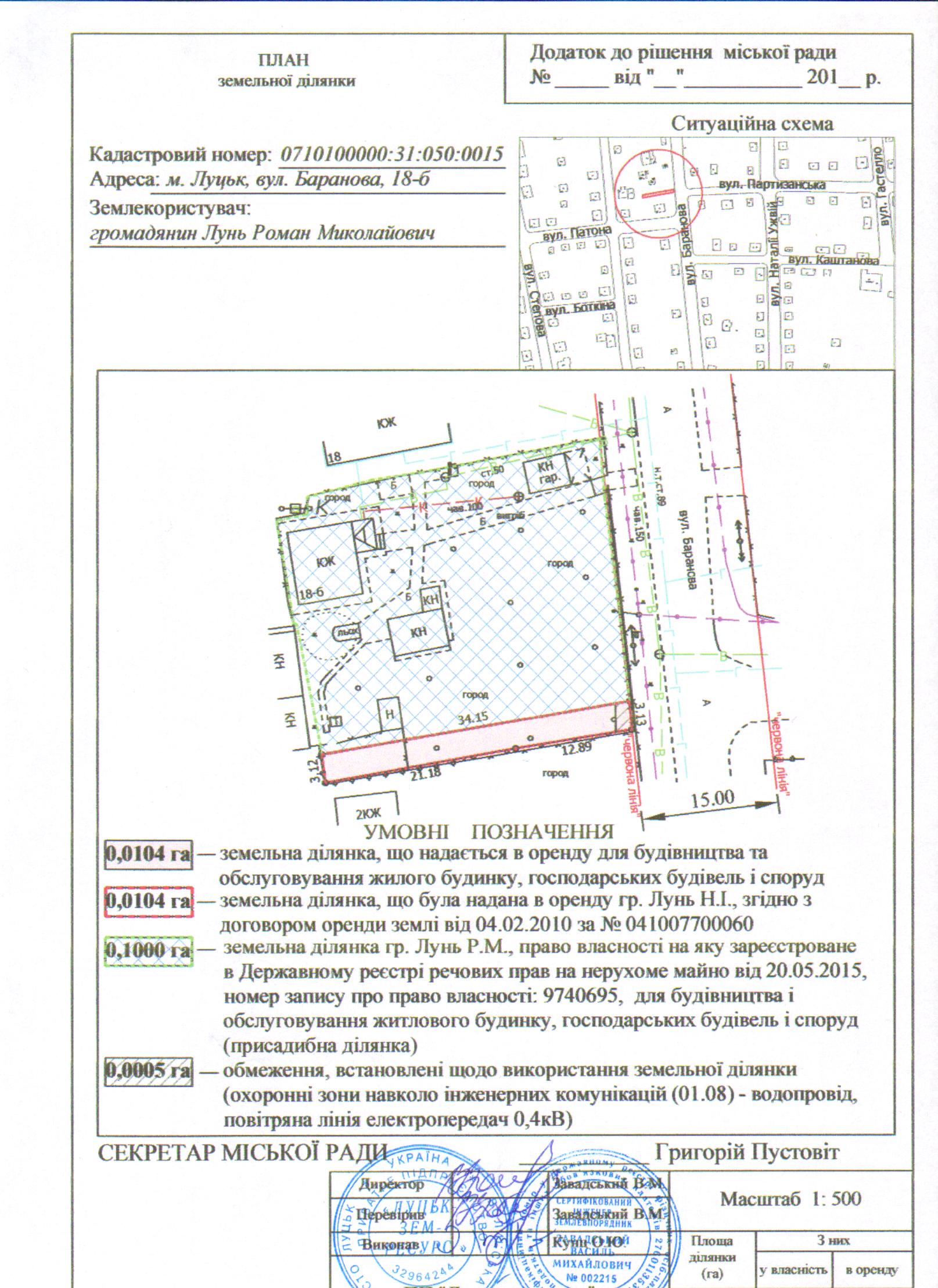 2. Надати громадянину Лунь Роману Миколайовичу земельну ділянку на вул. Баранова, 18-б, на умовах оренди строком на 25 років з дати укладення договору оренди землі, площею 0,0104 га, кадастровим номером 0710100000:31:050:0015, для будівництва та обслуговування жилого будинку, господарських будівель і споруд, з земель комунальної власності, згідно з додатком.