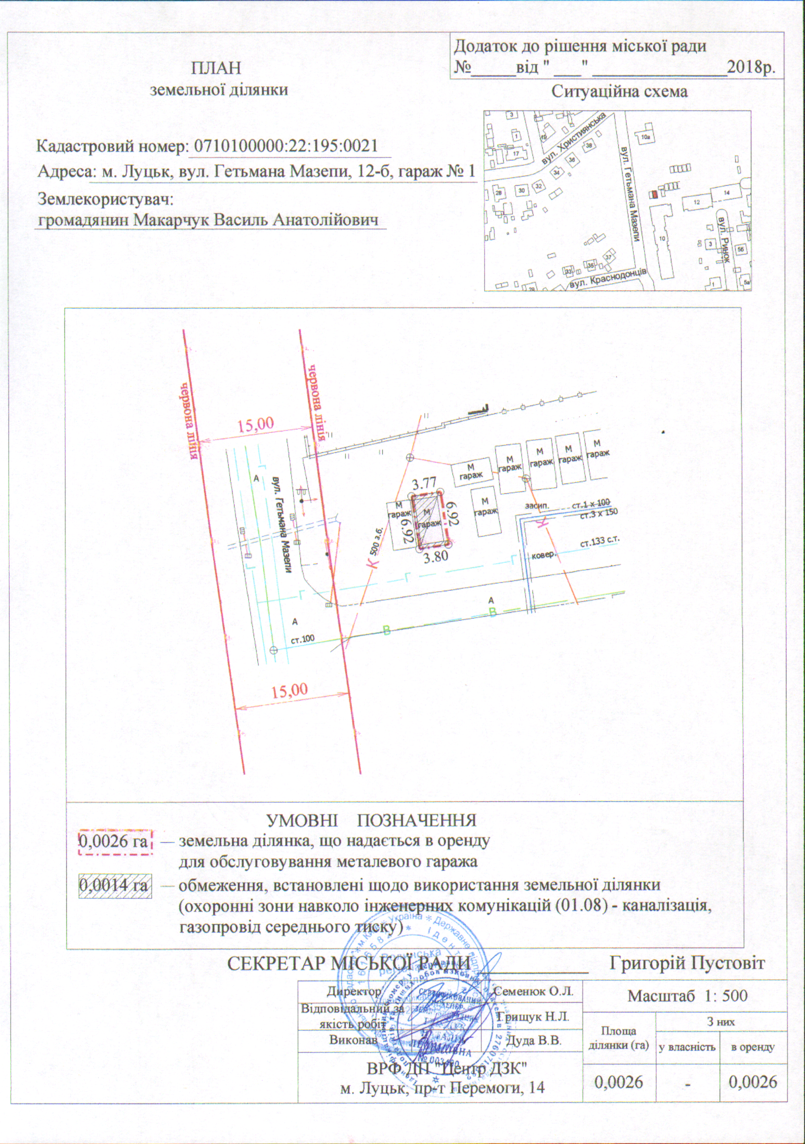 2. Надати громадянину Макарчуку Василю Анатолійовичу земельну ділянку на вул. Гетьмана Мазепи, 12-б, гараж № 1 на умовах оренди строком на 25 років, площею 0,0026 га, кадастровим номером 0710100000:22:195:0021, для обслуговування металевого гаража, згідно з додатком.
