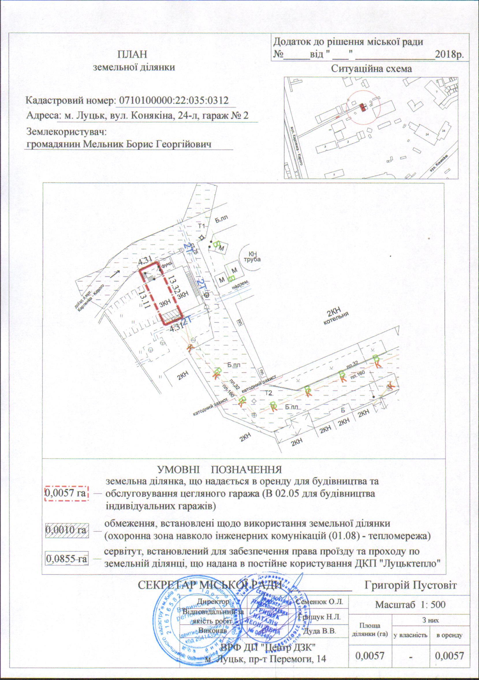 2. Надати громадянину Мельнику Борису Георгійовичу земельну ділянку на вул. Конякіна, 24-л, гараж № 2 на умовах оренди строком на 25 років з дати укладення договору оренди землі, площею 0,0057 га, кадастровим номером 0710100000:22:035:0312, для будівництва та обслуговування цегляного гаража (В 02.05 – для будівництва індивідуальних гаражів), згідно з додатком.