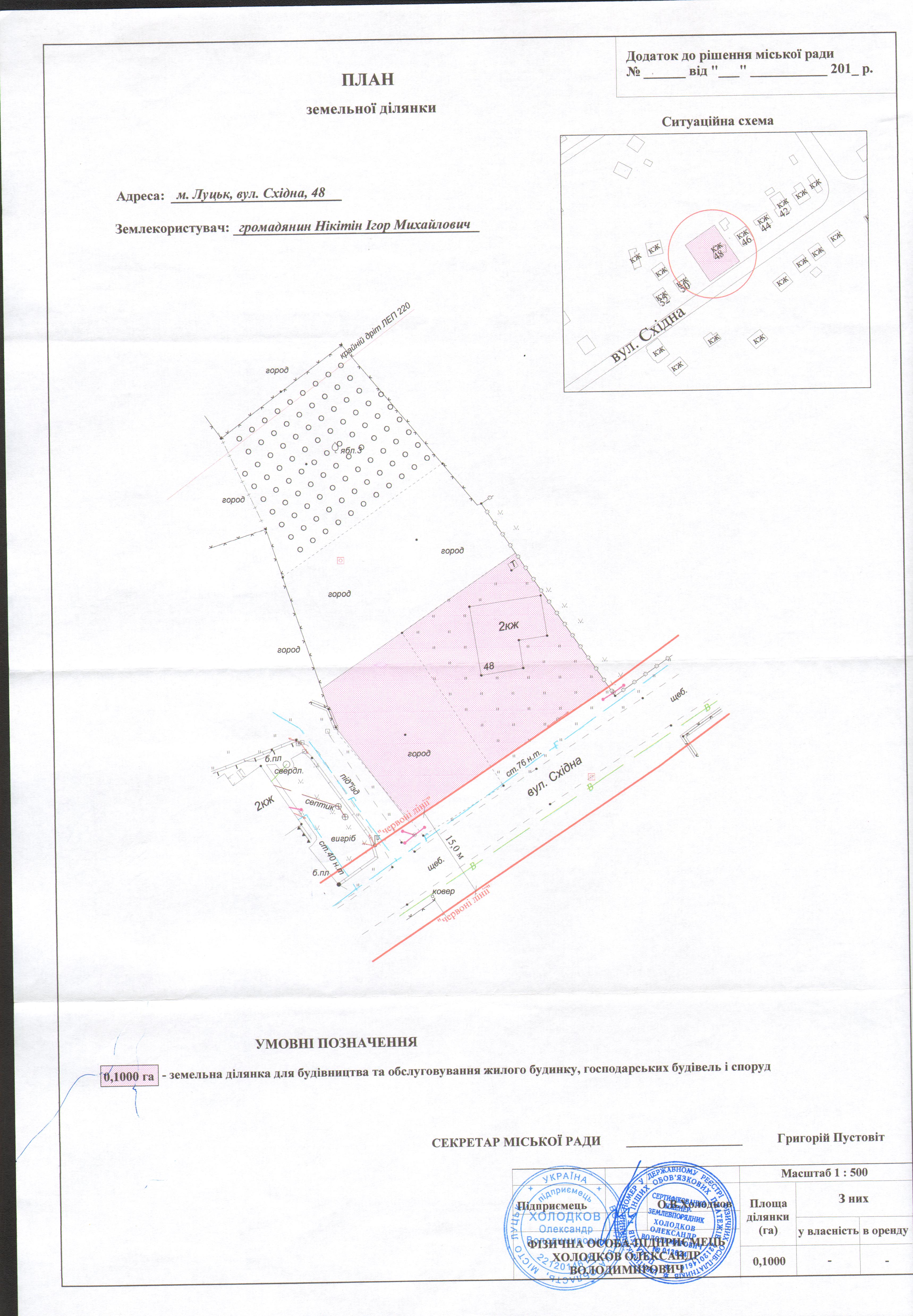 Розглянувши заяву громадянина Нікітіна Ігоря Михайловича про надання дозволу на розроблення технічної документації із землеустрою щодо встановлення (відновлення) меж земельної ділянки в натурі (на місцевості) на вул. Східній, 48, будівельний паспорт на забудову земельної ділянки, виписку із рішення виконавчого комітету Луцької міської Ради народних депутатів, акт про винесення в натуру меж земельної ділянки для будівництва індивідуальних державних і кооперативних будівель, архівний витяг з рішення виконавчого комітету Луцької міської Ради народних депутатів від 14.05.1992 №212 «Про виділення земельних ділянок», архівний витяг з рішення виконкому Луцької міської Ради від 30.01.1997 №45 «Про найменування та перейменування вулиць міста», керуючись статтями 12, 79-1, 96, 116, 118, 120, 121 Земельного кодексу України, Законом України «Про внесення змін до деяких законодавчих актів України щодо розмежування земель державної та комунальної власності», Законом України «Про землеустрій», Законом України «Про Державний земельний кадастр», Постановою Кабінету Міністрів України від 17.10.2012 № 1051 «Про затвердження Порядку ведення Державного земельного кадастру», ст. 26 Закону України «Про місцеве самоврядування в Україні», Генеральним планом міста Луцька, затвердженим рішенням міської ради від 24.06.2009 № 42/1 «Про затвердження Генерального плану міста», планом зонування міста Луцька, затвердженим рішенням міської ради від 25.02.2015 № 71/13 «Про затвердження плану зонування території міста Луцька», міська рада