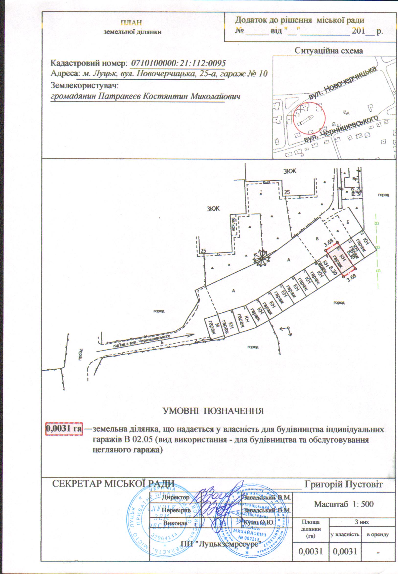 2. Надати громадянину Патракеєву Костянтину Миколайовичу у власність земельну ділянку на вул. Новочерчицькій, 25-а, гараж №10 площею 0,0031 га, кадастровим номером 0710100000:21:112:0095 для будівництва індивідуальних гаражів В 02.05 (вид використання – для будівництва та обслуговування цегляного гаража), згідно з додатком.