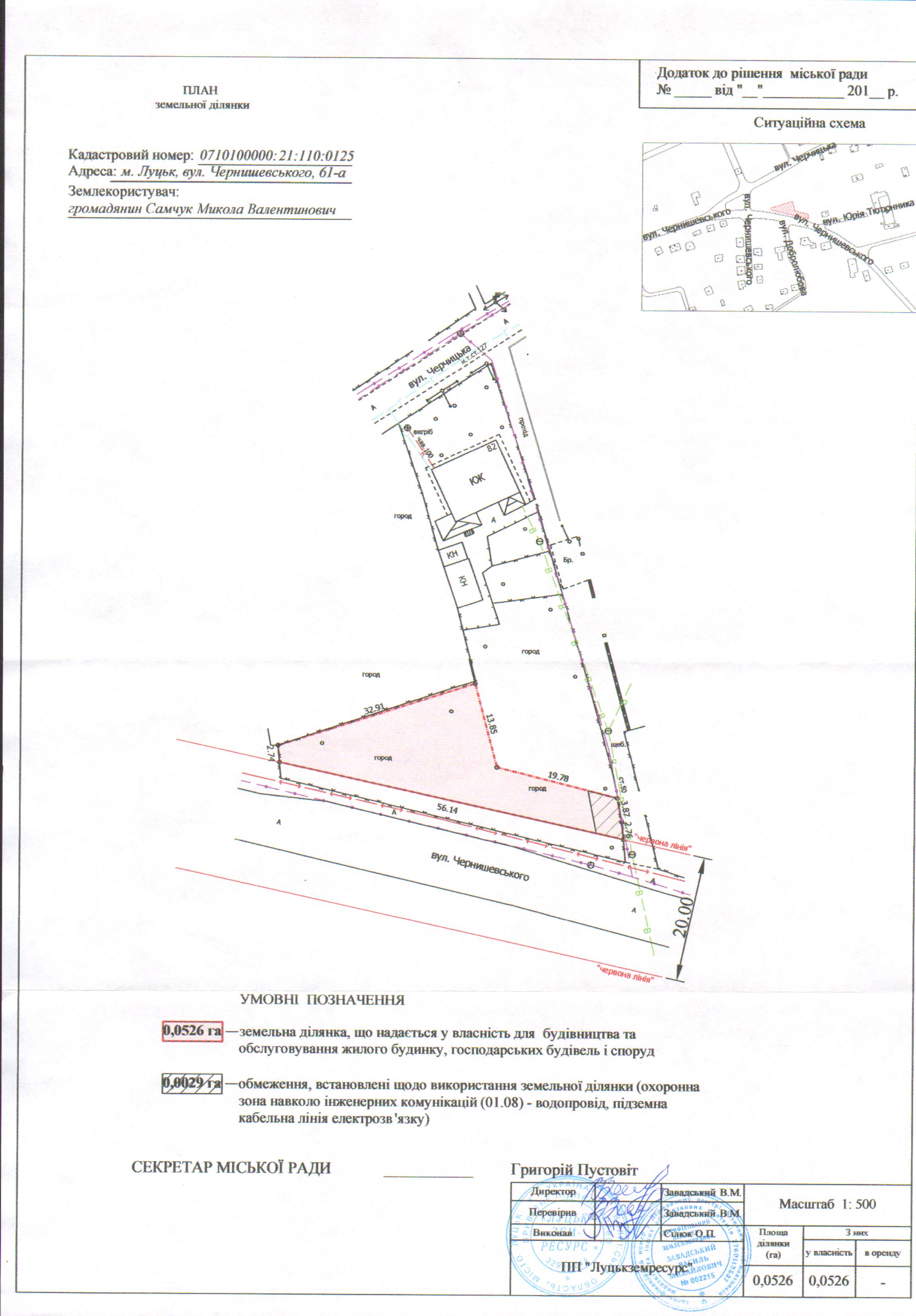 1. Затвердити громадянину Самчуку Миколі Валентиновичу проект землеустрою щодо відведення земельної ділянки на вул. Чернишевського, 61-а площею 0,0526 га, кадастровим номером 0710100000:21:110:0125 для будівництва та обслуговування жилого будинку, господарських будівель і споруд.