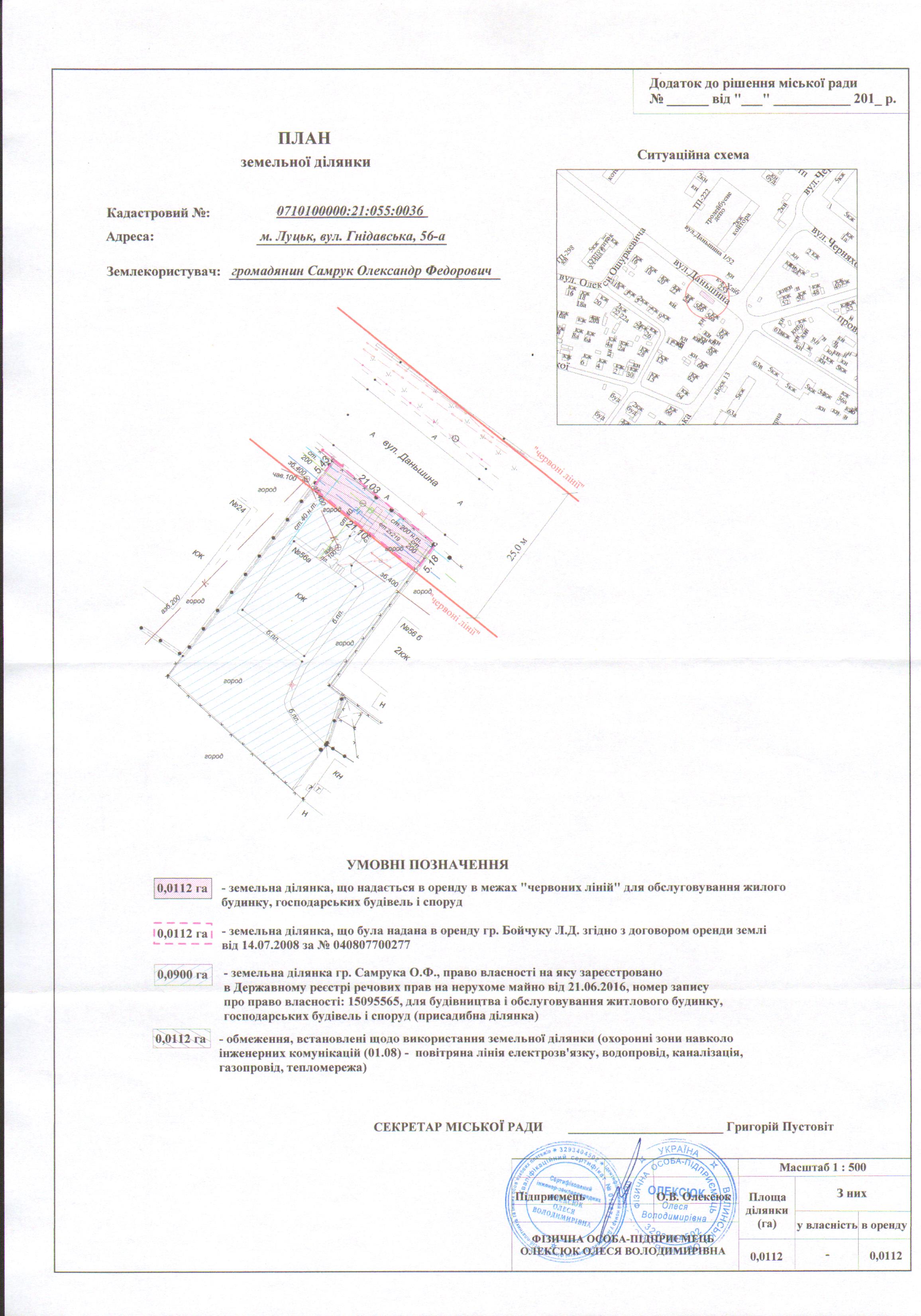 2. Надати громадянину Самруку Олександру Федоровичу земельну ділянку на вул. Гнідавській, 56-а, на умовах оренди строком на 25 років з дати укладення договору оренди землі, площею 0,0112 га, кадастровим номером 0710100000:21:055:0036, в межах “червоних ліній” для обслуговування жилого будинку, господарських будівель і споруд, з земель комунальної власності, згідно з додатком.
