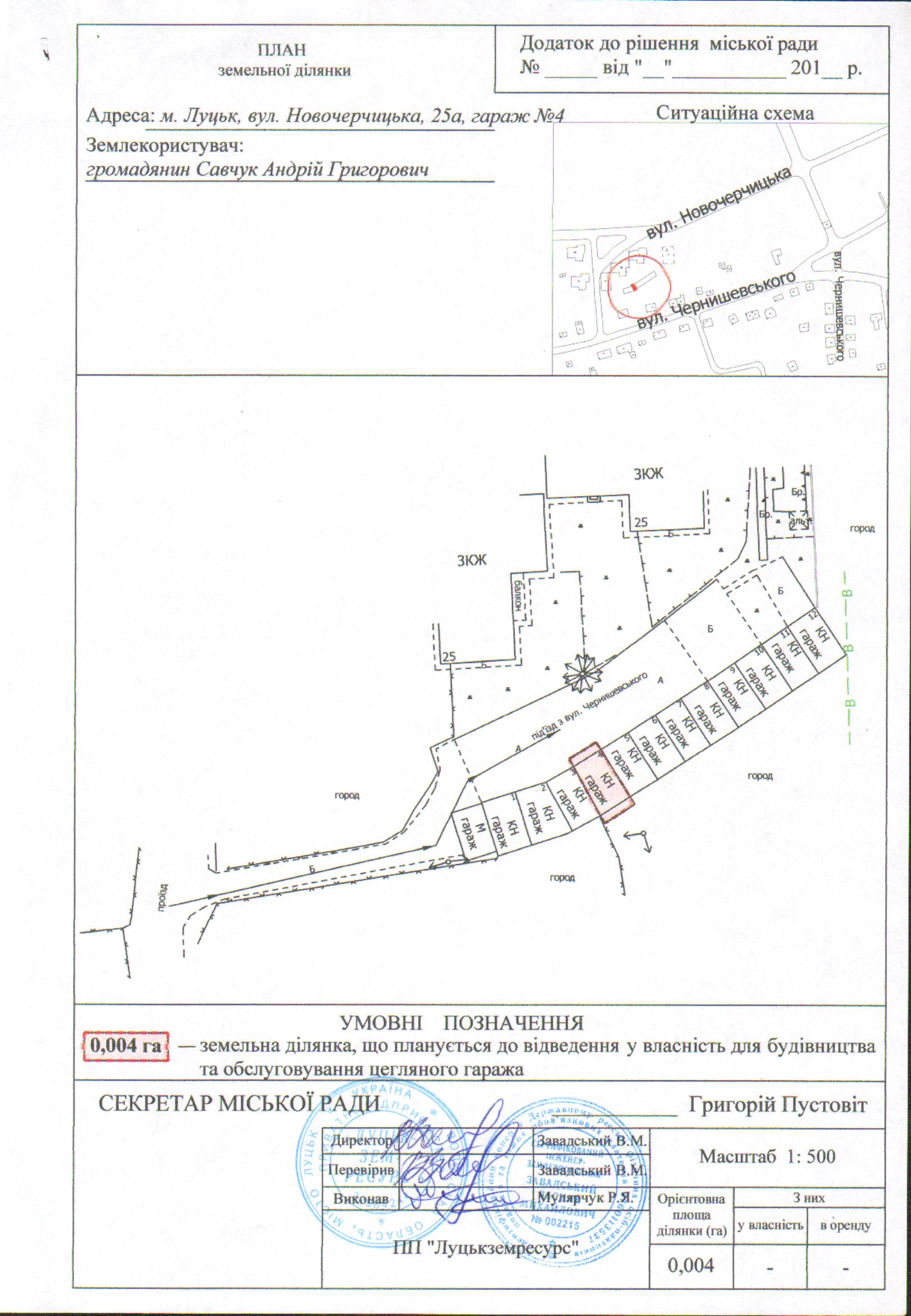 Розглянувши заяву громадянина Савчука Андрія Григоровича про надання дозволу на розроблення проекту землеустрою щодо відведення земельної ділянки на вул. Новочерчицькій, 25а, гараж №4 для будівництва та обслуговування цегляного гаража, технічний паспорт на об’єкт нерухомого майна, договір купівлі-продажу гаража, витяг з Державного реєстру речових прав на нерухоме майно про реєстрацію права власності, генплан земельної ділянки, лист управління містобудування та архітектури Луцької міської ради щодо режиму забудови даної території, визначеної для містобудівних потреб генеральним планом м. Луцька та довідку з Головного управління Держгеокадастру у Волинській області, керуючись статтями 12, 116, 118, 121-122 Земельного кодексу України, Законом України «Про землеустрій», ст. 26 Закону України «Про місцеве самоврядування в Україні», Генеральним планом міста Луцька, затвердженим рішенням міської ради від 24.06.2009 № 42/1 «Про затвердження Генерального плану міста», планом зонування міста Луцька, затвердженим рішенням міської ради від 31.03.2014 № 57/30 «Про затвердження плану зонування території міста Луцька», міська рада