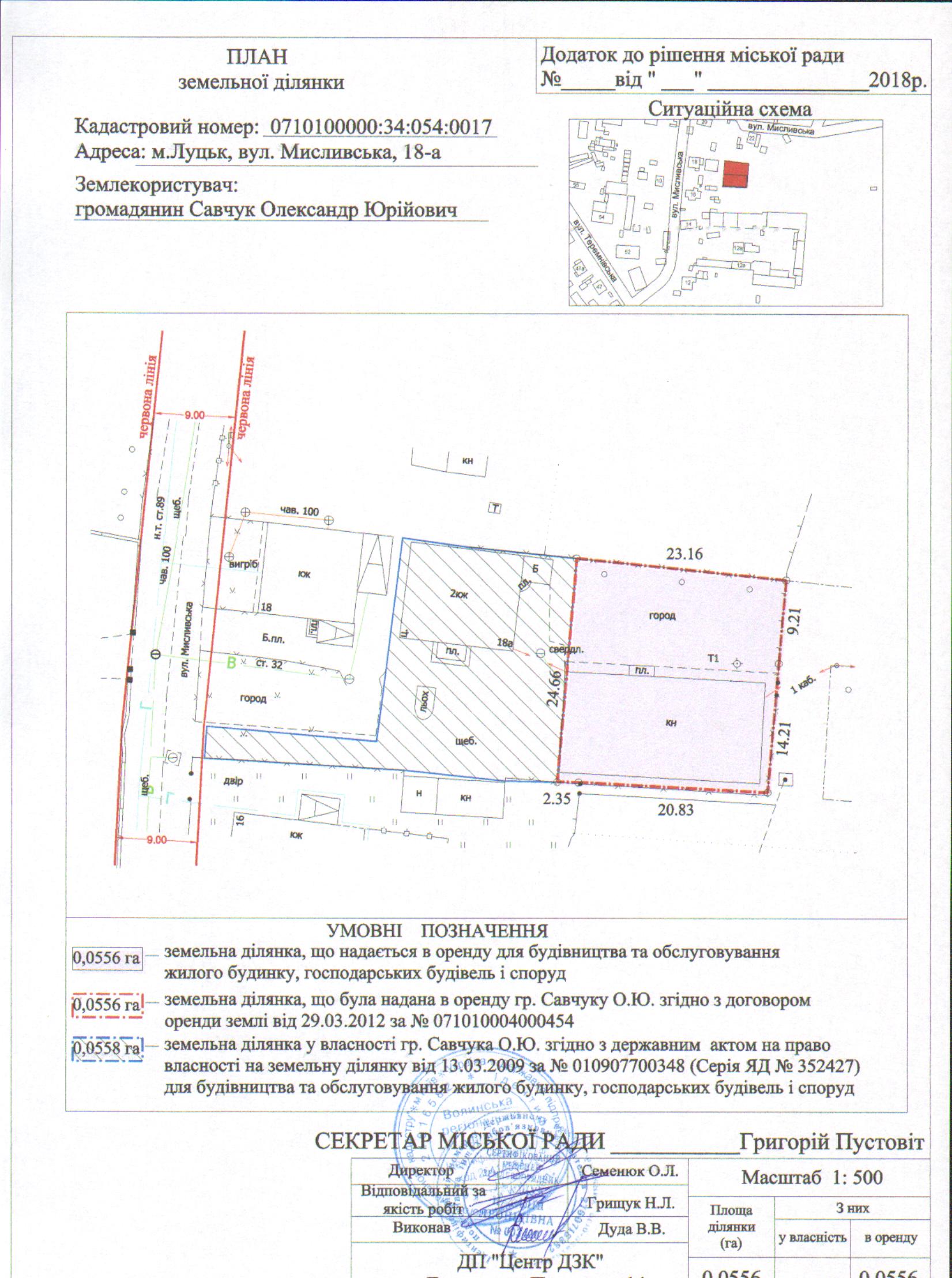 2. Надати громадянину Савчуку Олександру Юрійовичу земельну ділянку на вул. Мисливській, 18-а, на умовах оренди строком на 25 років з дати укладення договору оренди землі, площею 0,0556 га, кадастровим номером 0710100000:34:054:0017, для будівництва та обслуговування жилого будинку, господарських будівель і споруд, з земель комунальної власності, згідно з додатком.
