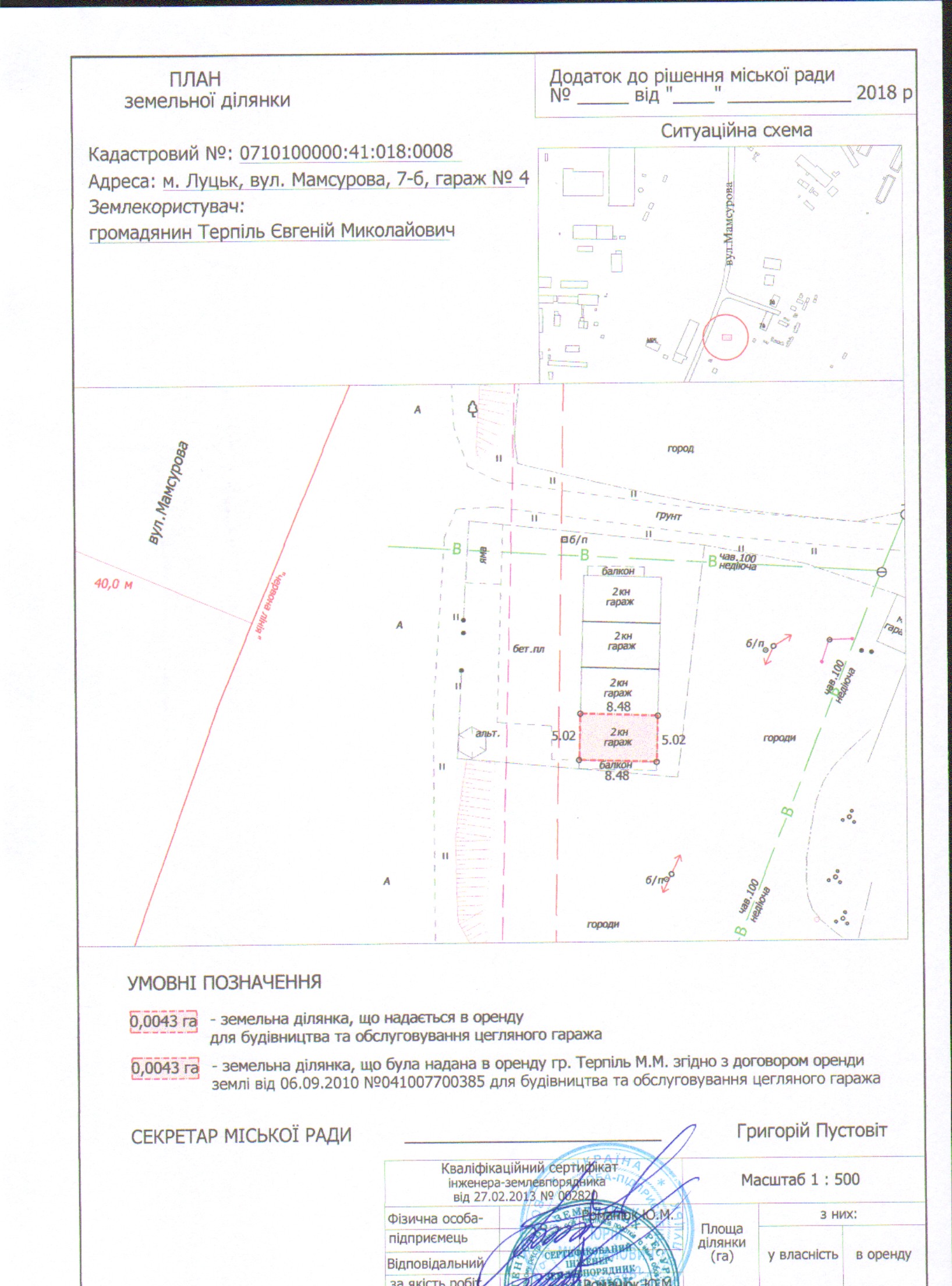 2. Надати громадянину Терпілю Євгенію Миколайовичу земельну ділянку на вул. Мамсурова, 7-б, гараж № 4, на умовах оренди строком на 25 років з дати укладення договору оренди землі, площею 0,0043 га, кадастровим номером 0710100000:41:018:0008, для будівництва та обслуговування цегляного гаража, з земель комунальної власності, згідно з додатком.