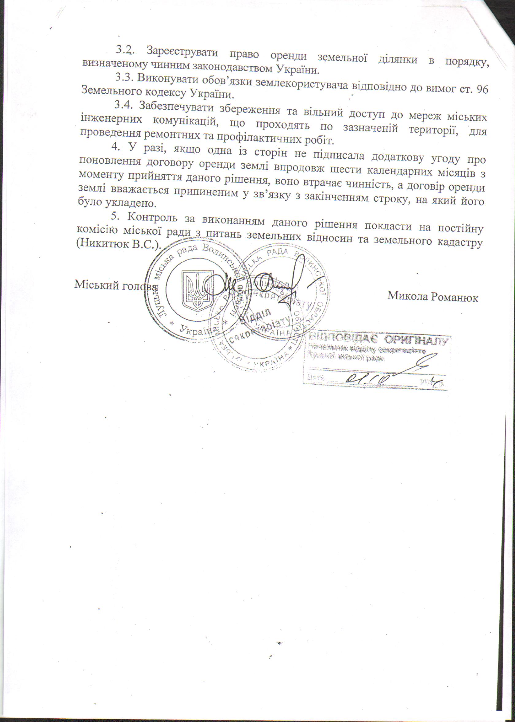 5. Контроль за виконанням даного рішення покласти на постійну комісію міської ради з питань земельних відносин та земельного кадастру (Козлюк О.Є.).