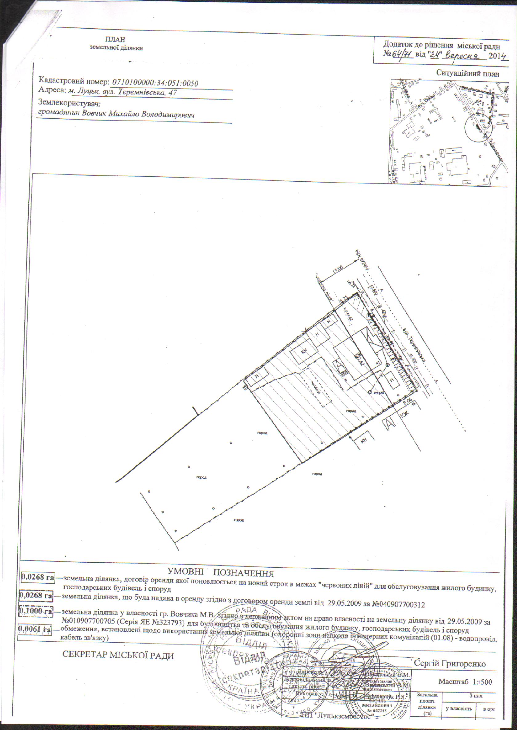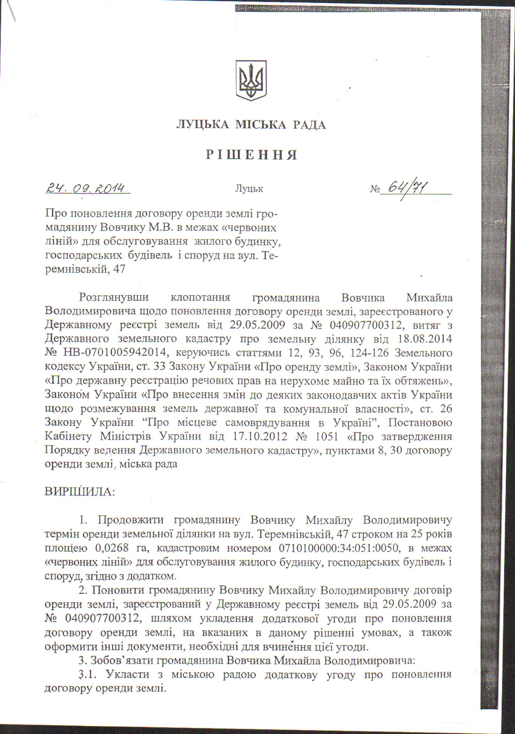 4. Рішення Луцької міської ради від 24.09.2014 № 64/71 “Про поновлення договору оренди землі громадянину Вовчику М.В. в межах «червоних ліній» для обслуговування жилого будинку, господарських будівель і споруд на вул. Теремнівській, 47” втратило чинність у зв’язку із неукладенням додаткової угоди про поновлення договору оренди землі.