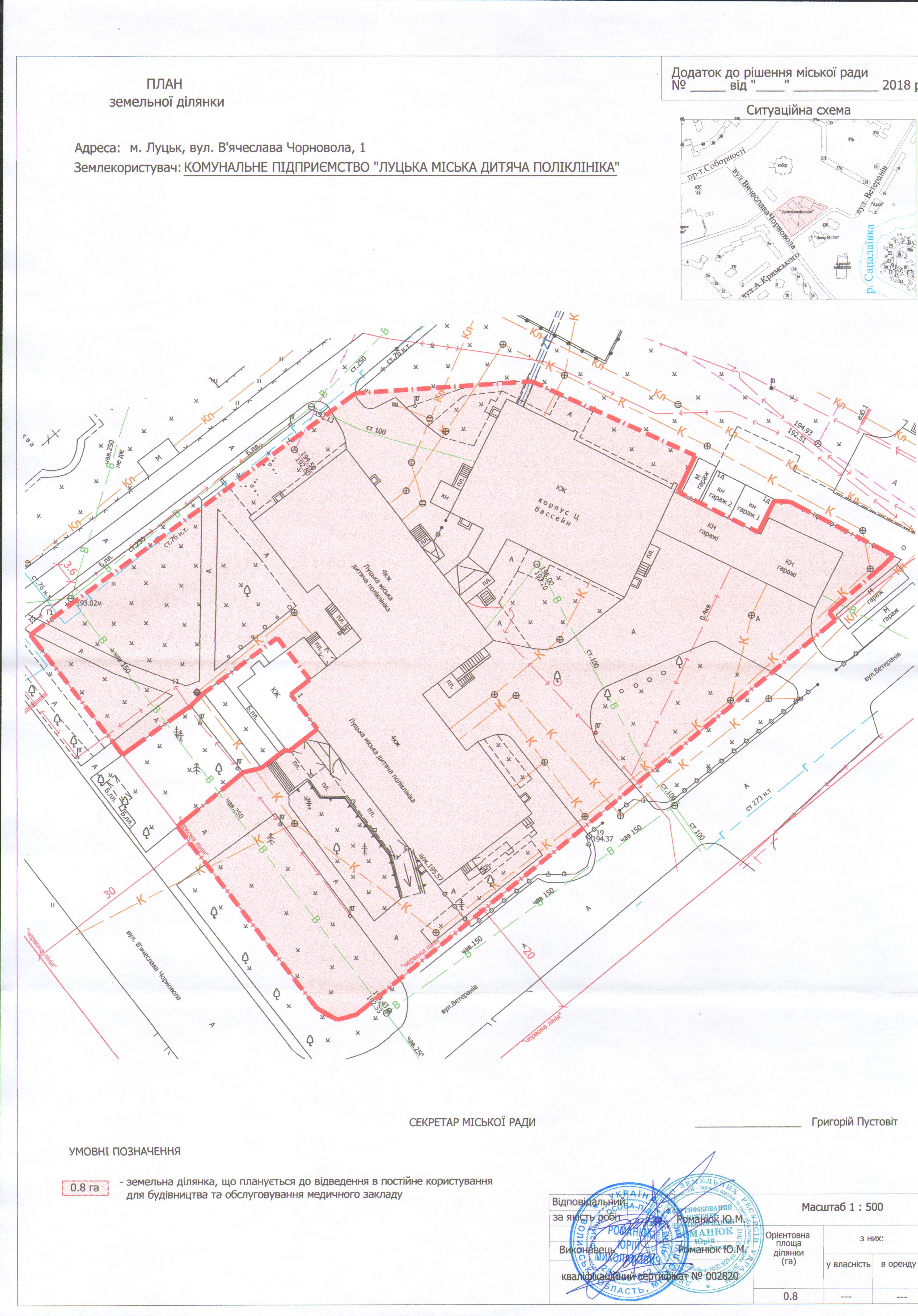 2. КОМУНАЛЬНОМУ ПІДПРИЄМСТВУ «ЛУЦЬКА МІСЬКА ДИТЯЧА ПОЛІКЛІНІКА» подати на затвердження розроблений проект землеустрою щодо відведення земельної ділянки на вул. В’ячеслава
