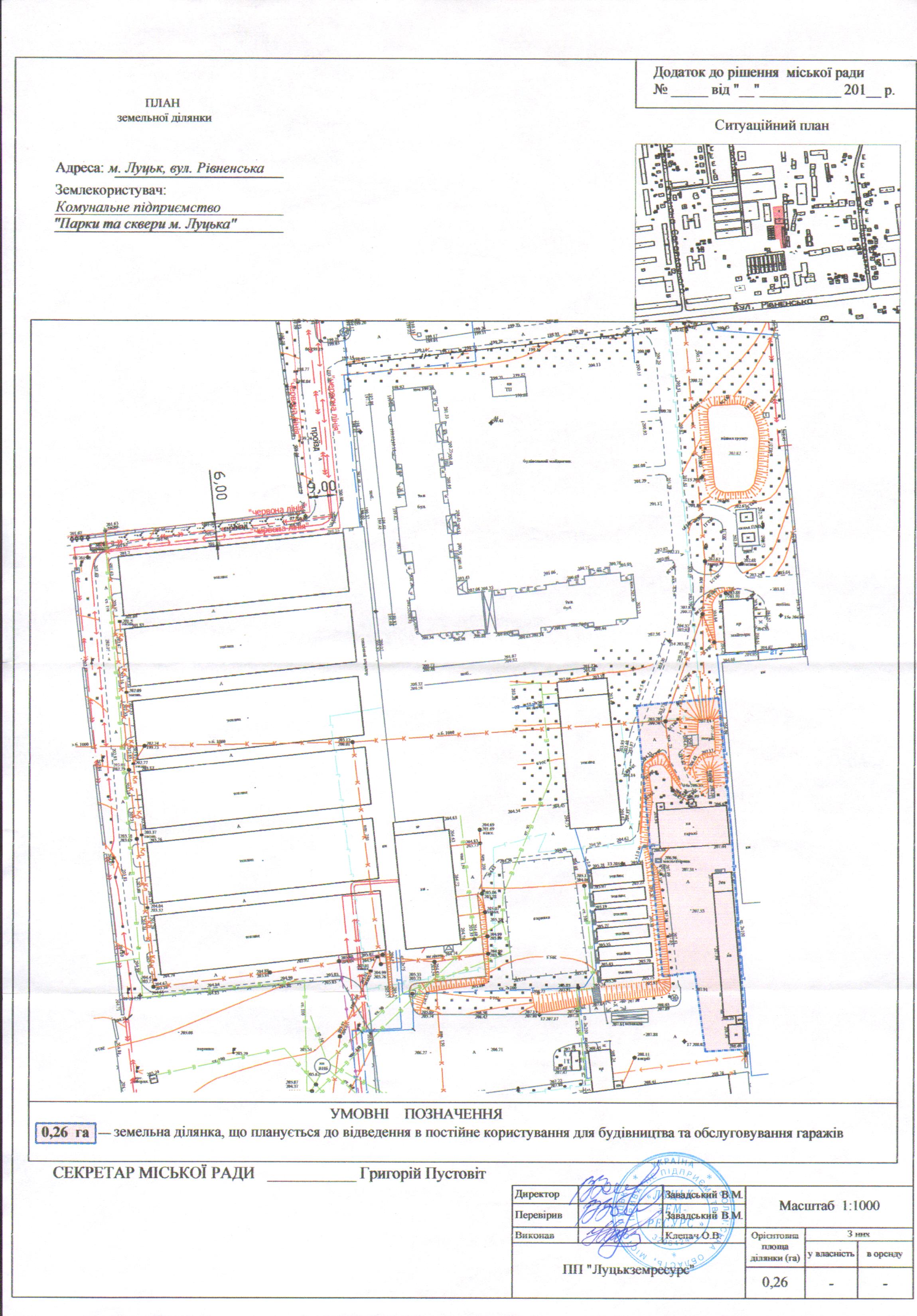2. Комунальному підприємству «Парки та сквери м. Луцька» подати на затвердження розроблений проект землеустрою щодо відведення земельної ділянки для будівництва та обслуговування гаражів на вул. Рівненській, орієнтовною площею 0,26 га, в порядку, визначеному чинним законодавством України.