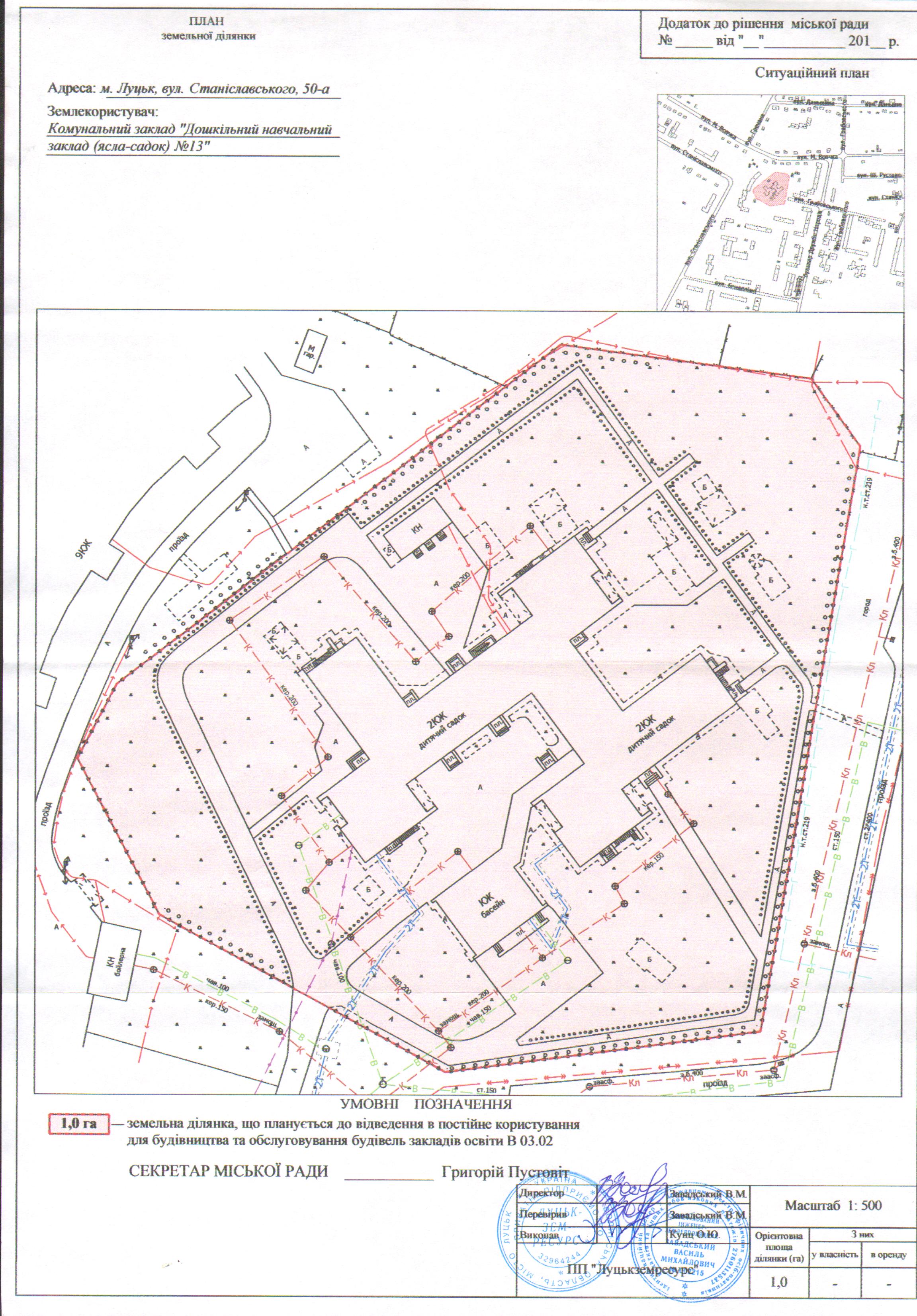2. Комунальному закладу «Дошкільний навчальний заклад №13» Луцької міської ради подати на затвердження розроблений проект землеустрою щодо відведення земельної ділянки на вул. Станіславського, 50-а, орієнтовною площею 1,0 га, для будівництва та обслуговування будівель закладів освіти (В 03.02), в порядку, визначеному чинним законодавством України.