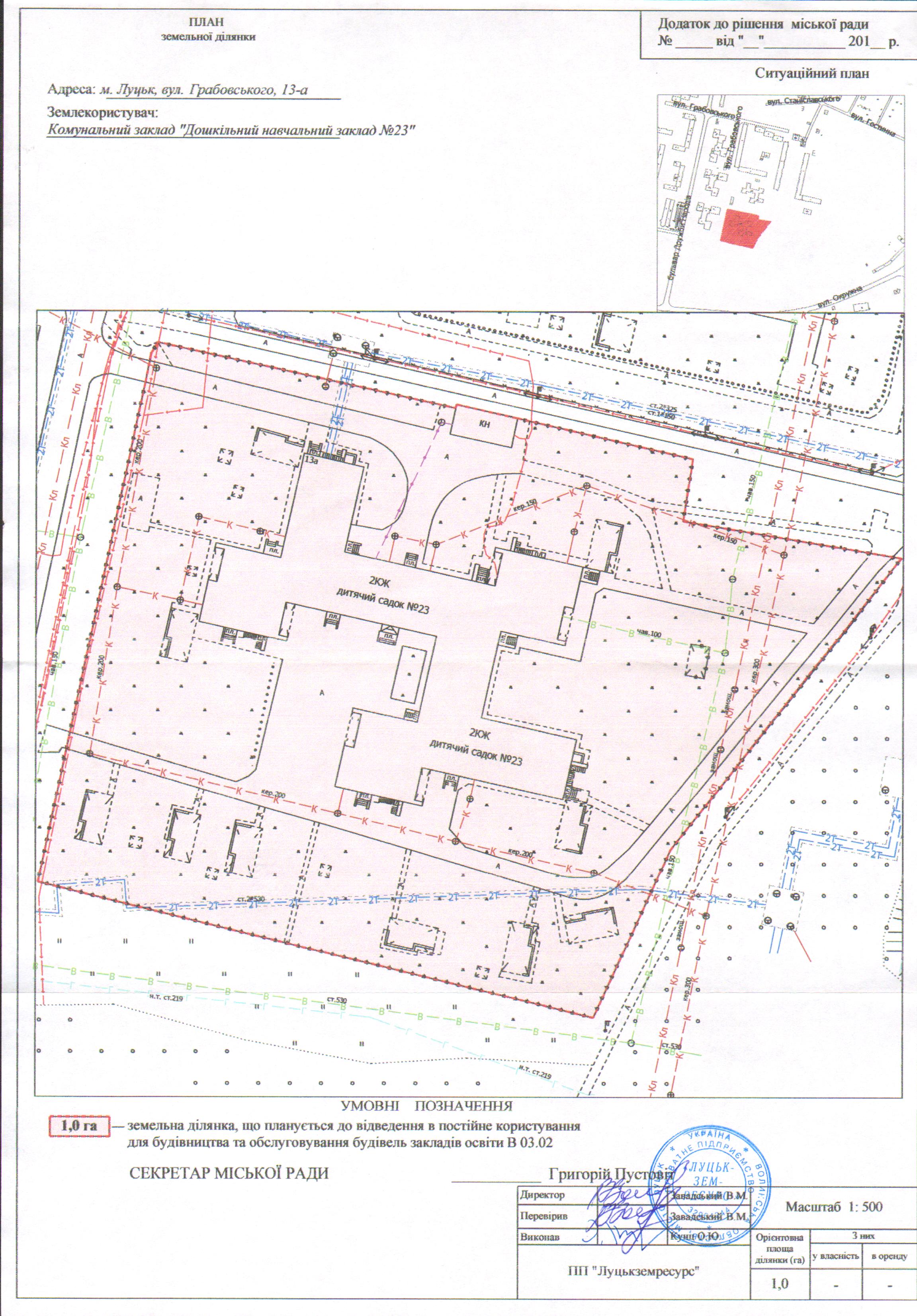 2. Комунальному закладу «Дошкільний навчальний заклад №23» Луцької міської ради подати на затвердження розроблений проект землеустрою щодо відведення земельної ділянки на вул. Грабовського, 13-а, орієнтовною площею 1,0 га, для будівництва та обслуговування будівель закладів освіти (В 03.02), в порядку, визначеному чинним законодавством України.