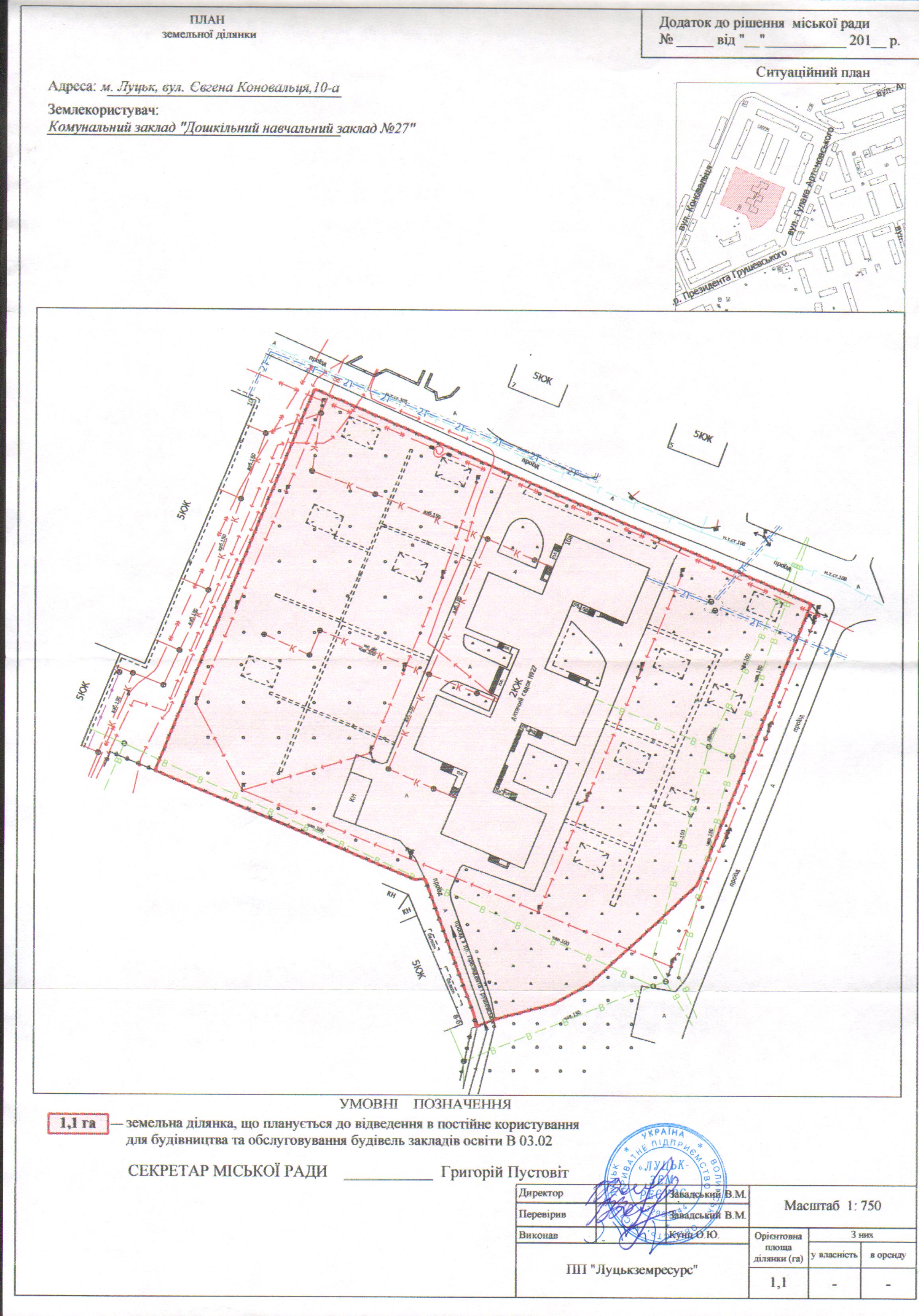 2. Комунальному закладу «Дошкільний навчальний заклад №27» Луцької міської ради подати на затвердження розроблений проект землеустрою щодо відведення земельної ділянки на вул. Євгена Коновальця, 10-а, орієнтовною площею 1,1 га, для будівництва та обслуговування будівель закладів освіти (В 03.02), в порядку, визначеному чинним законодавством України.
