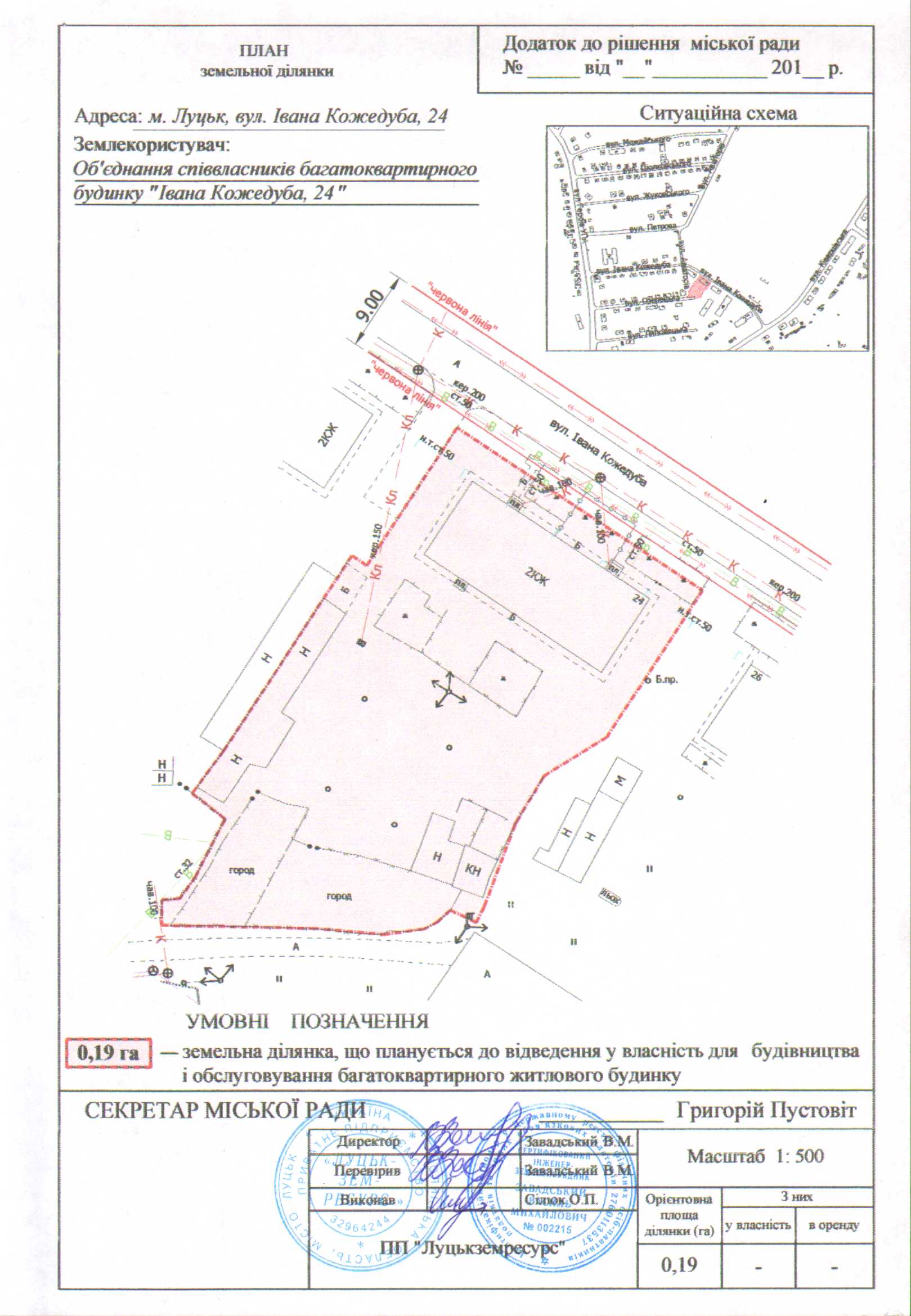 2. Об’єднанню співвласників багатоквартирного будинку «Івана Кожедуба, 24» подати на затвердження розроблений проект землеустрою щодо відведення у власність земельної ділянки на вул. Івана Кожедуба, 24 орієнтовною площею 0,19 га для будівництва і обслуговування багатоквартирного житлового будинку в порядку, визначеному чинним законодавством України.