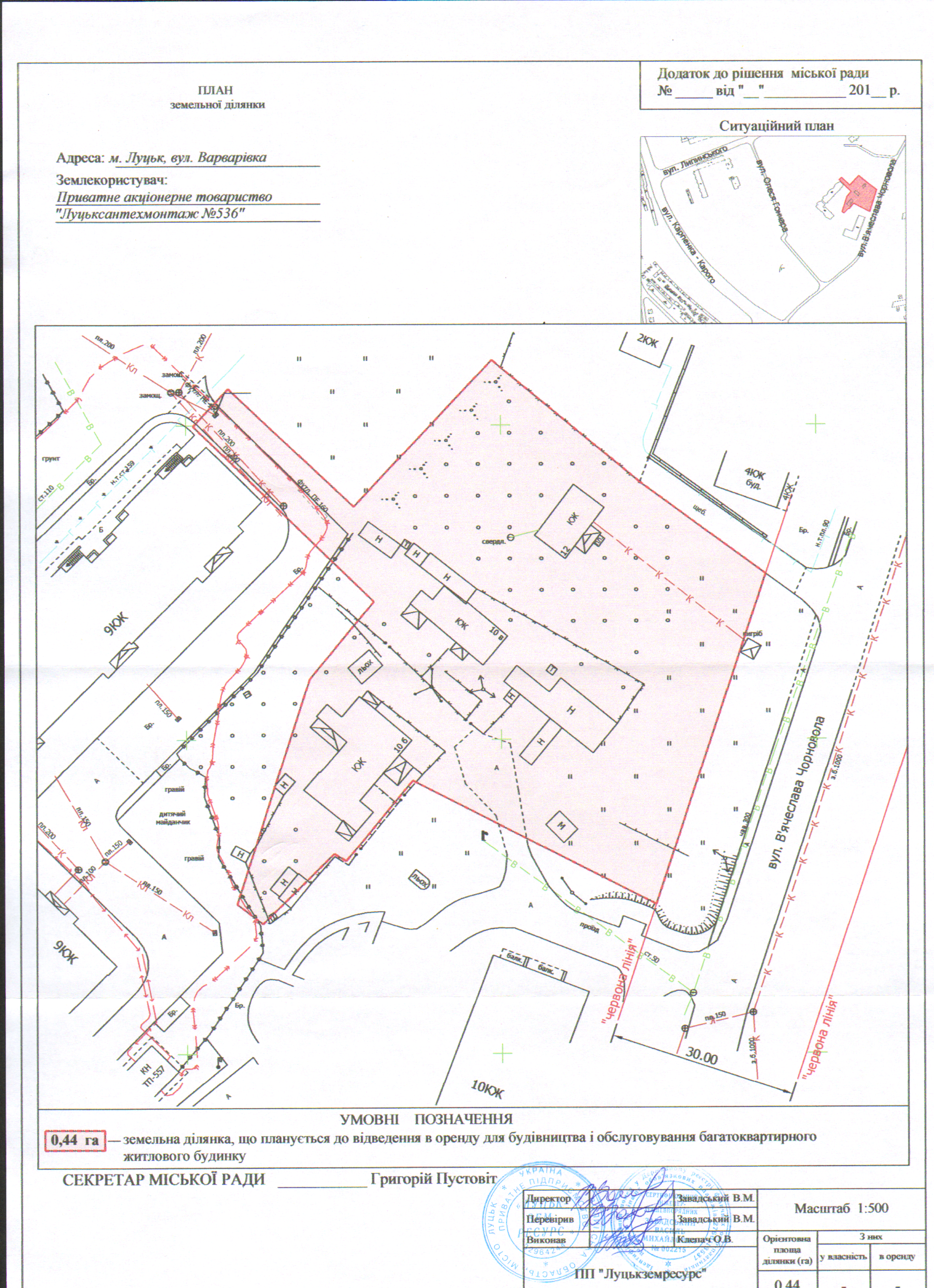 1. Надати Приватному акціонерному товариству «Луцьксантехмонтаж № 536» дозвіл на розроблення проекту землеустрою щодо відведення земельної ділянки на умовах оренди для будівництва і обслуговування багатоквартирного житлового будинку на вул. Варварівка, орієнтовною площею 0,44 га, з земель комунальної власності, згідно з додатком.