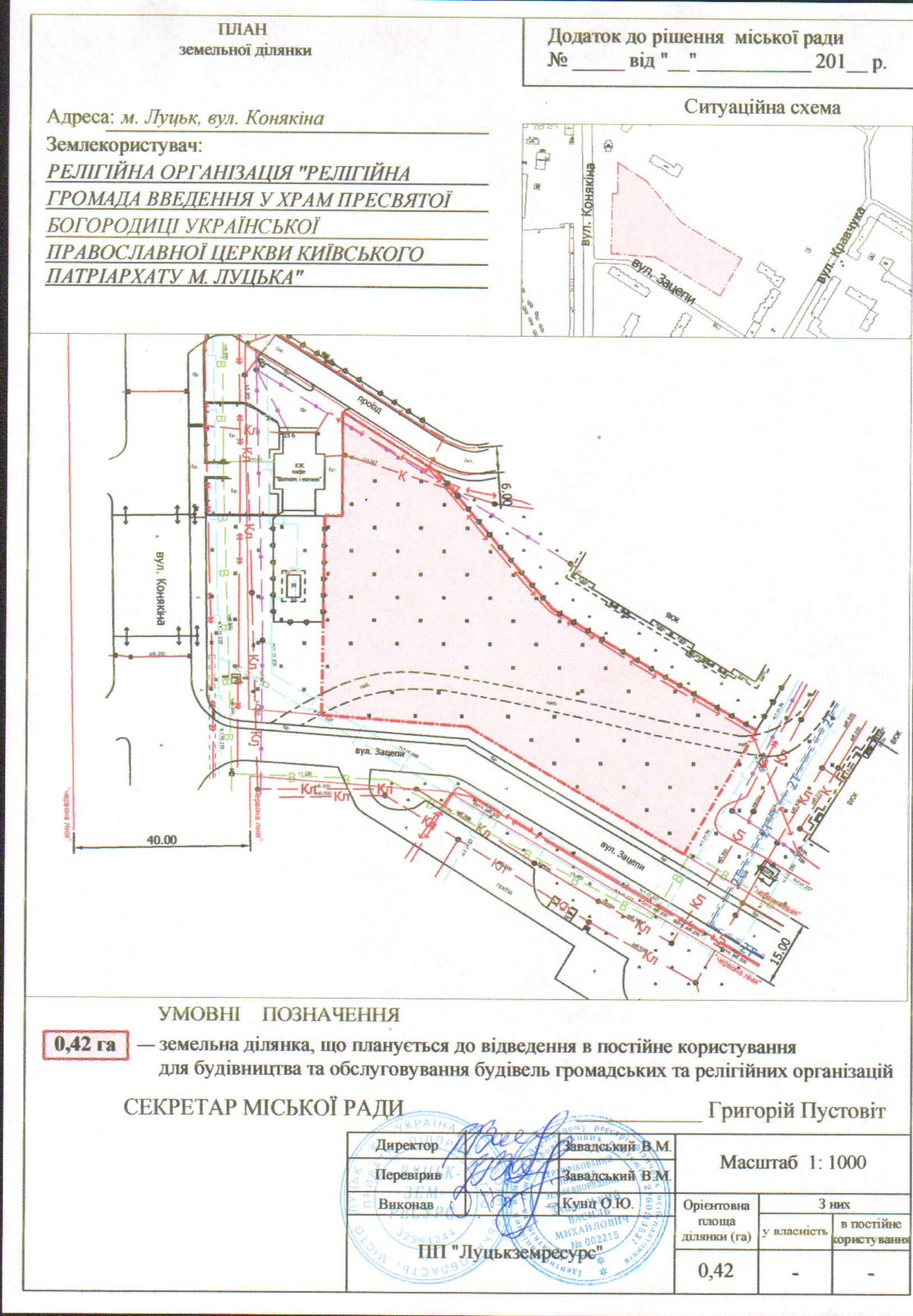 2. РЕЛІГІЙНІЙ ОРГАНІЗАЦІЇ «РЕЛІГІЙНА ГРОМАДА ВВЕДЕННЯ У ХРАМ ПРЕСВЯТОЇ БОГОРОДИЦІ УКРАЇНСЬКОЇ ПРАВОСЛАВНОЇ ЦЕРКВИ КИЇВСЬКОГО ПАТРІАРХАТУ М. ЛУЦЬКА» подати на затвердження розроблений проект землеустрою щодо відведення земельної ділянки для будівництва та обслуговування будівель громадських та релігійних організацій (В 03.04) на вул. Конякіна, орієнтовною площею 0,42 га, в порядку, визначеному чинним законодавством України.