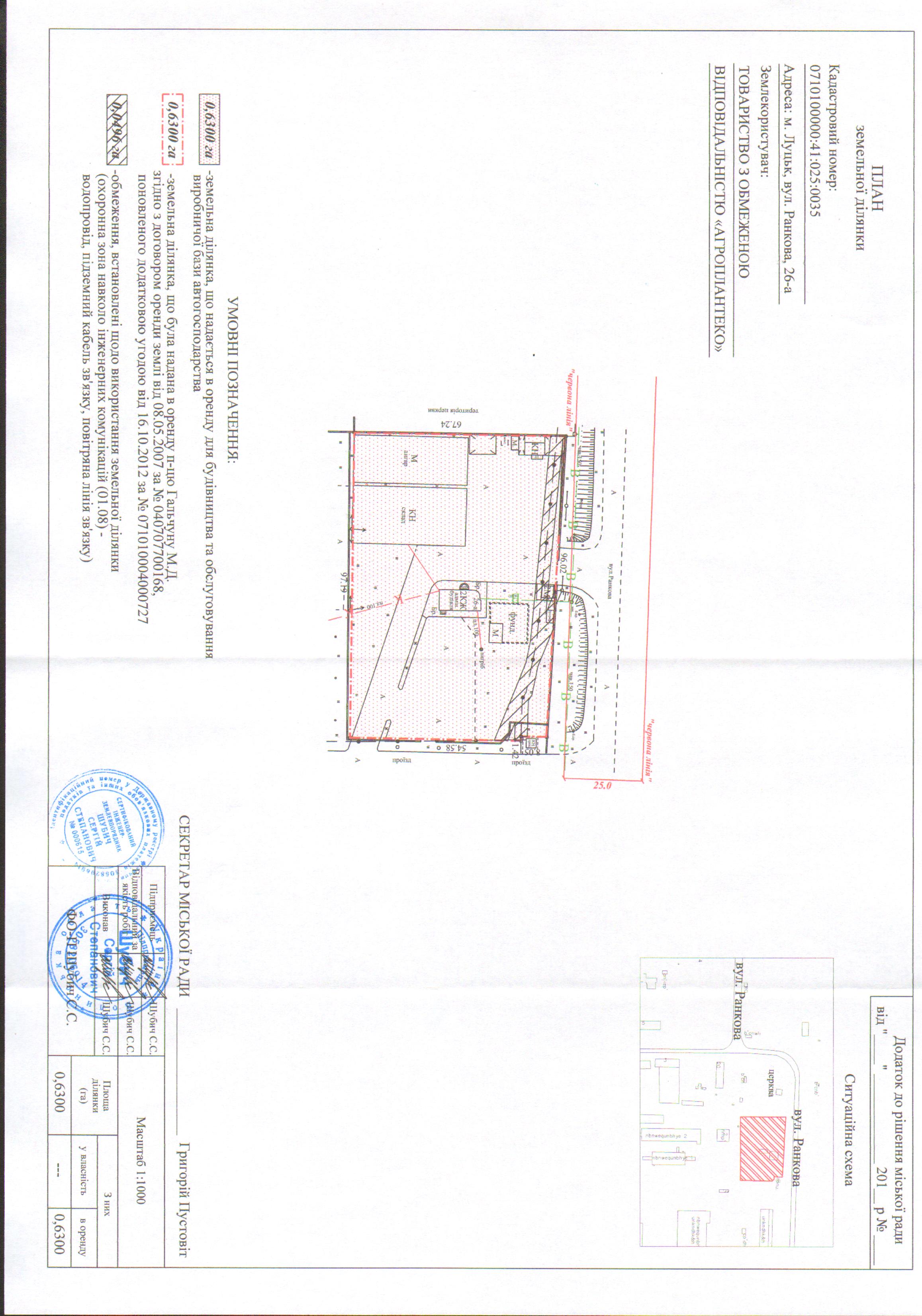 1. Затвердити ТОВАРИСТВУ З ОБМЕЖЕНОЮ ВІДПОВІДАЛЬНІСТЮ «АГРОПЛАНТЕКО» технічну документацію із землеустрою щодо встановлення (відновлення) меж земельної ділянки в натурі (на місцевості) на вул. Ранковій, 26-а, площею 0,6300 га, кадастровим номером 0710100000:41:025:0035, для будівництва та обслуговування виробничої бази автогосподарства.