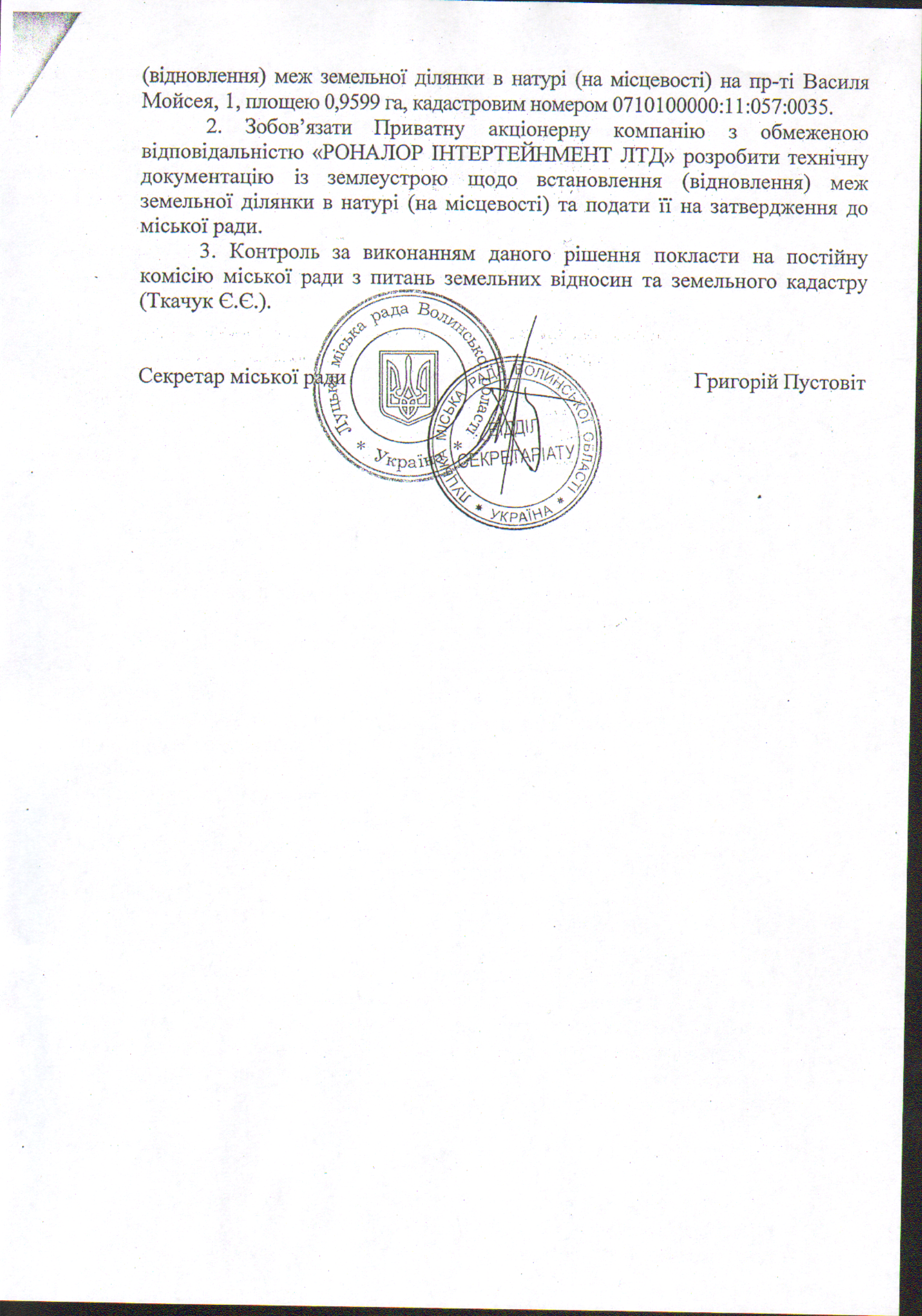 1. Скасувати рішення Луцької міської ради від 22.12.2017 № 36/79 «Про надання ПрАКзОВ «РОНАЛОР ІНТЕРТЕЙНМЕНТ ЛТД» дозволу на розроблення технічної документації із землеустрою щодо встановлення (відновлення) меж земельної ділянки в натурі (на місцевості) на пр-ті Василя Мойсея, 1».