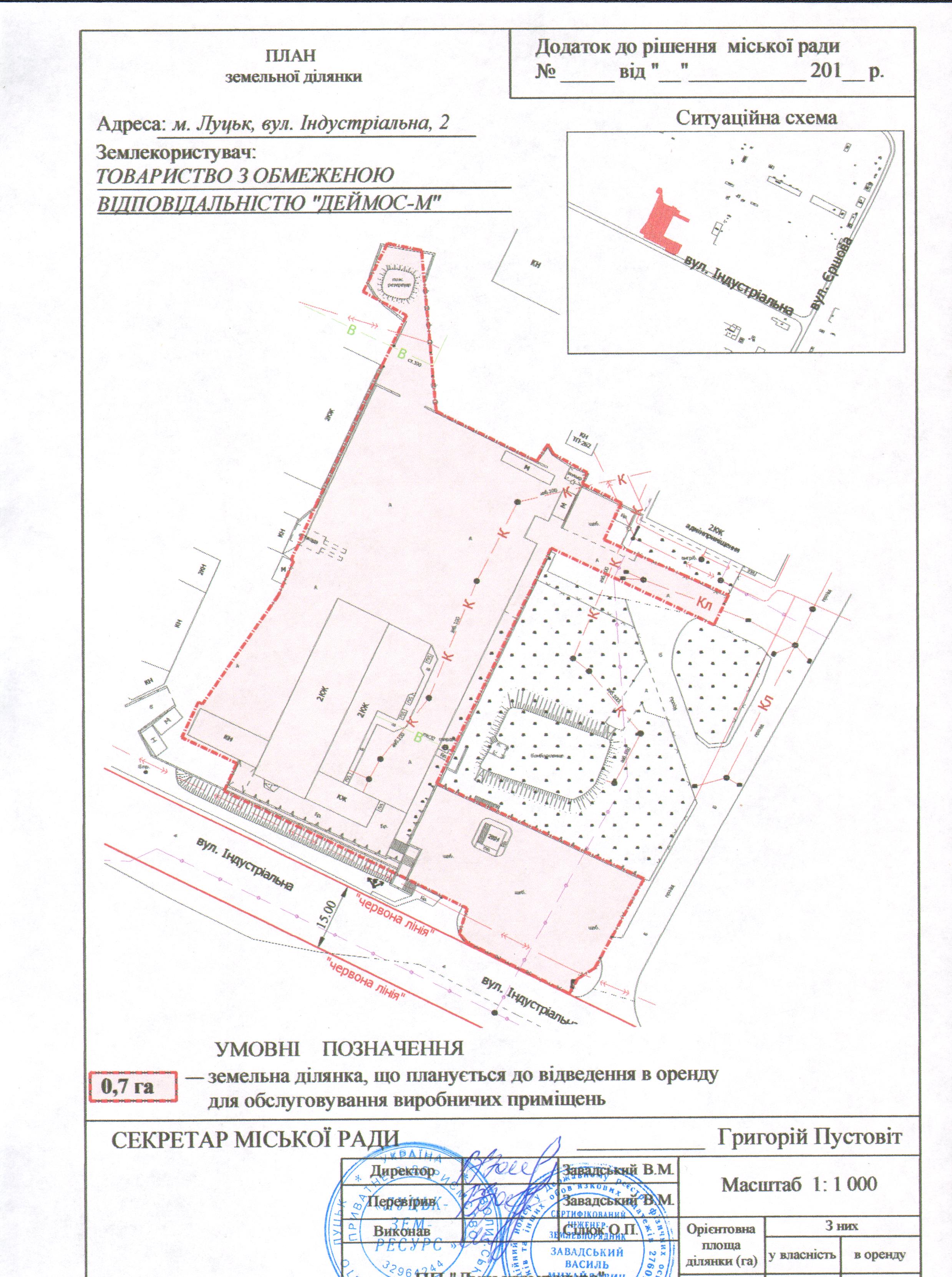 Розглянувши клопотання ТОВАРИСТВА З ОБМЕЖЕНОЮ ВІДПОВІДАЛЬНІСТЮ «ДЕЙМОС-М» про надання дозволу на розроблення проекту землеустрою щодо відведення земельної ділянки в оренду на вул. Індустріальній, 2 для обслуговування виробничих приміщень, схему генплану земельної ділянки з прикладеним листом управління містобудування та архітектури Луцької міської ради щодо режиму забудови даної території, визначеної для містобудівних потреб, встановлених у генеральному плані міста Луцька, враховуючи правовстановлюючі документи ТОВАРИСТВА З ОБМЕЖЕНОЮ ВІДПОВІДАЛЬНІСТЮ «ДЕЙМОС-М» на об’єкти нерухомого майна на вул. Індустріальній, 2: договір лізингу від 01.07.2002 № 628/1, додаток № 2 до договору лізингу № 628/1 від 01.07.2002, додаткова угода до договору лізингу № 628/1 від 20.04.2007, договір про заміну осіб у зобов’язанні від 23.04.2007, акт приймання-передачі майна від 27.04.2007, відповідно до яких зареєстроване право власності на колірний цех від 06.06.2007, реєстраційний номер: 18771338; технічний паспорт на об’єкт нерухомого майна від 17.04.2014, технічний паспорт на будівлю прохідної від 05.11.2017, керуючись статтями 12, 93, 96, 123 Земельного кодексу України, статтею 7 Закону України «Про оренду землі», статтею 50 Закону України «Про землеустрій», Законом України «Про регулювання містобудівної діяльності», Законом України «Про внесення змін до деяких законодавчих актів України щодо розмежування земель державної та комунальної власності», статтею 26 Закону України «Про місцеве самоврядування в Україні», міська рада