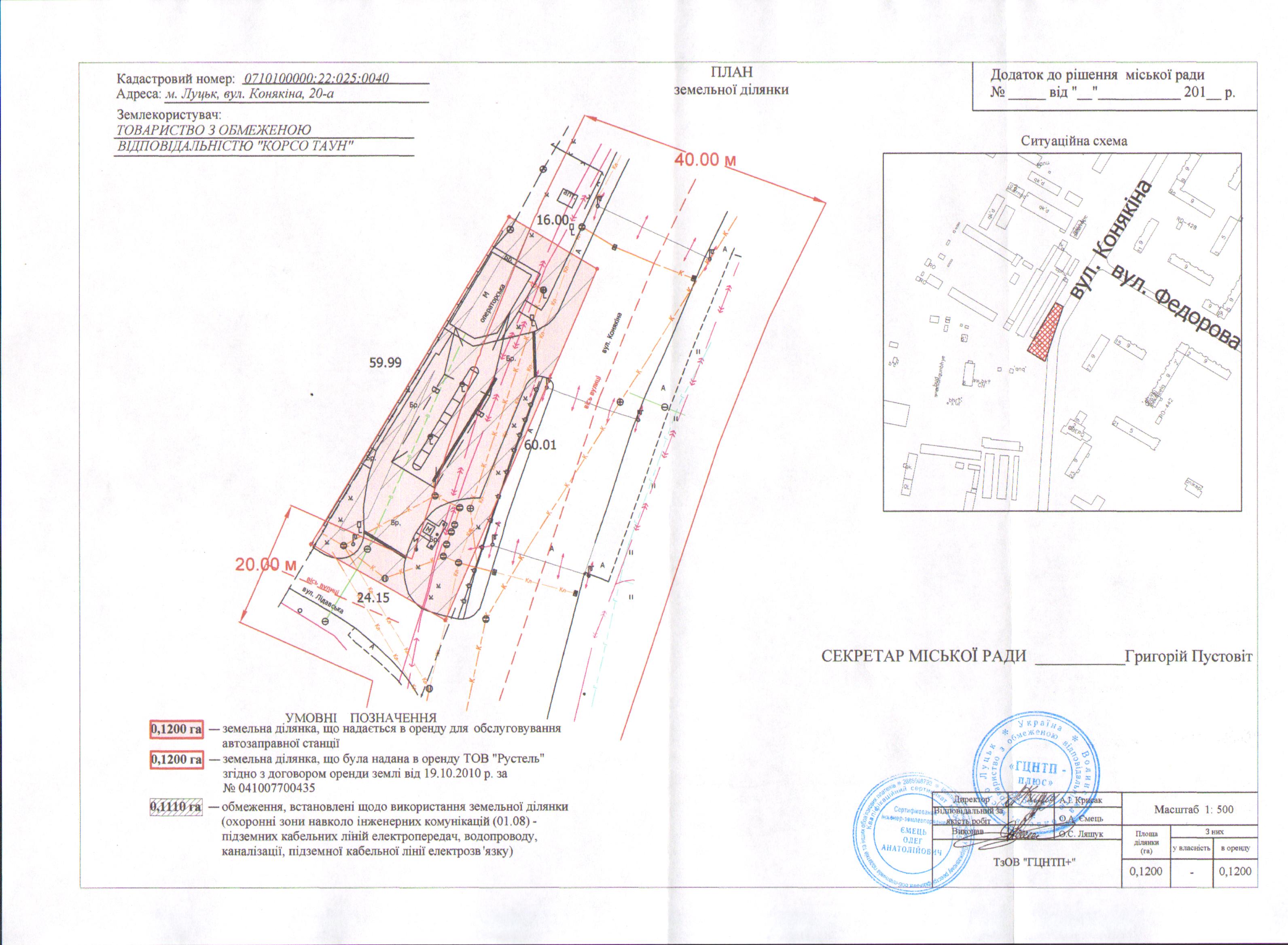 2. Надати ТОВАРИСТВУ З ОБМЕЖЕНОЮ ВІДПОВІДАЛЬНІСТЮ «КОРСО ТАУН» земельну ділянку на вул. Конякіна, 20-а, на умовах оренди строком на 10 років з дати укладення договору оренди землі, площею 0,1200 га, кадастровим номером 0710100000:22:025:0040, для обслуговування автозаправної станції, згідно з додатком.