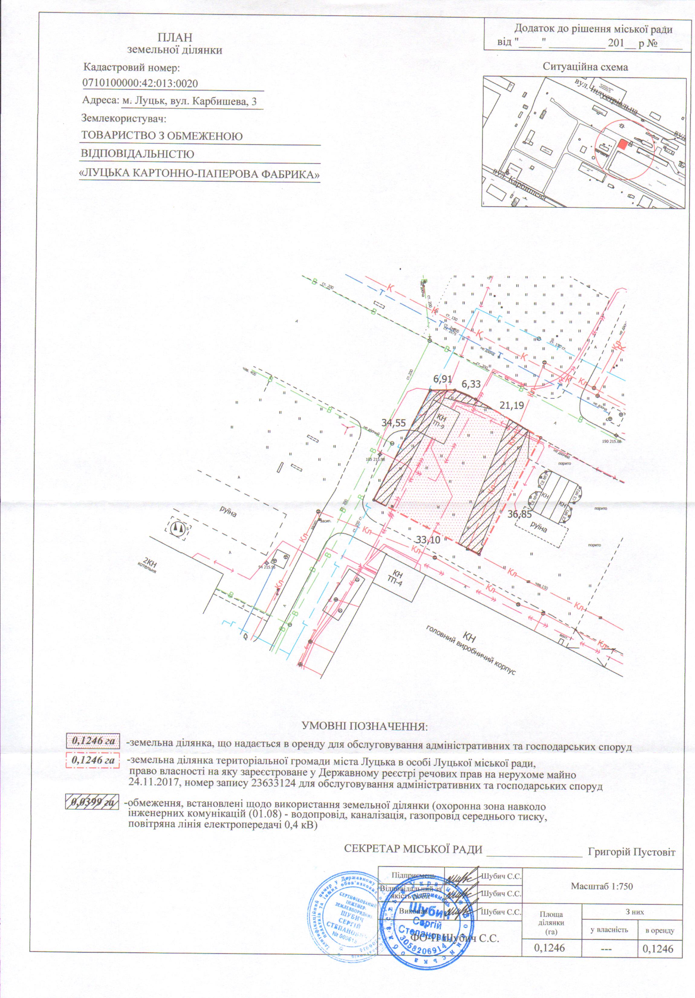 1. Надати ТОВАРИСТВУ З ОБМЕЖЕНОЮ ВІДПОВІДАЛЬНІСТЮ «ЛУЦЬКА КАРТОННО-ПАПЕРОВА ФАБРИКА» земельну ділянку на вул. Карбишева, 3, на умовах оренди строком на 10 років з дати укладення договору оренди землі, площею 0,1246 га, кадастровим номером 0710100000:42:013:0020, для обслуговування адміністративних та господарських споруд, згідно з додатком.
