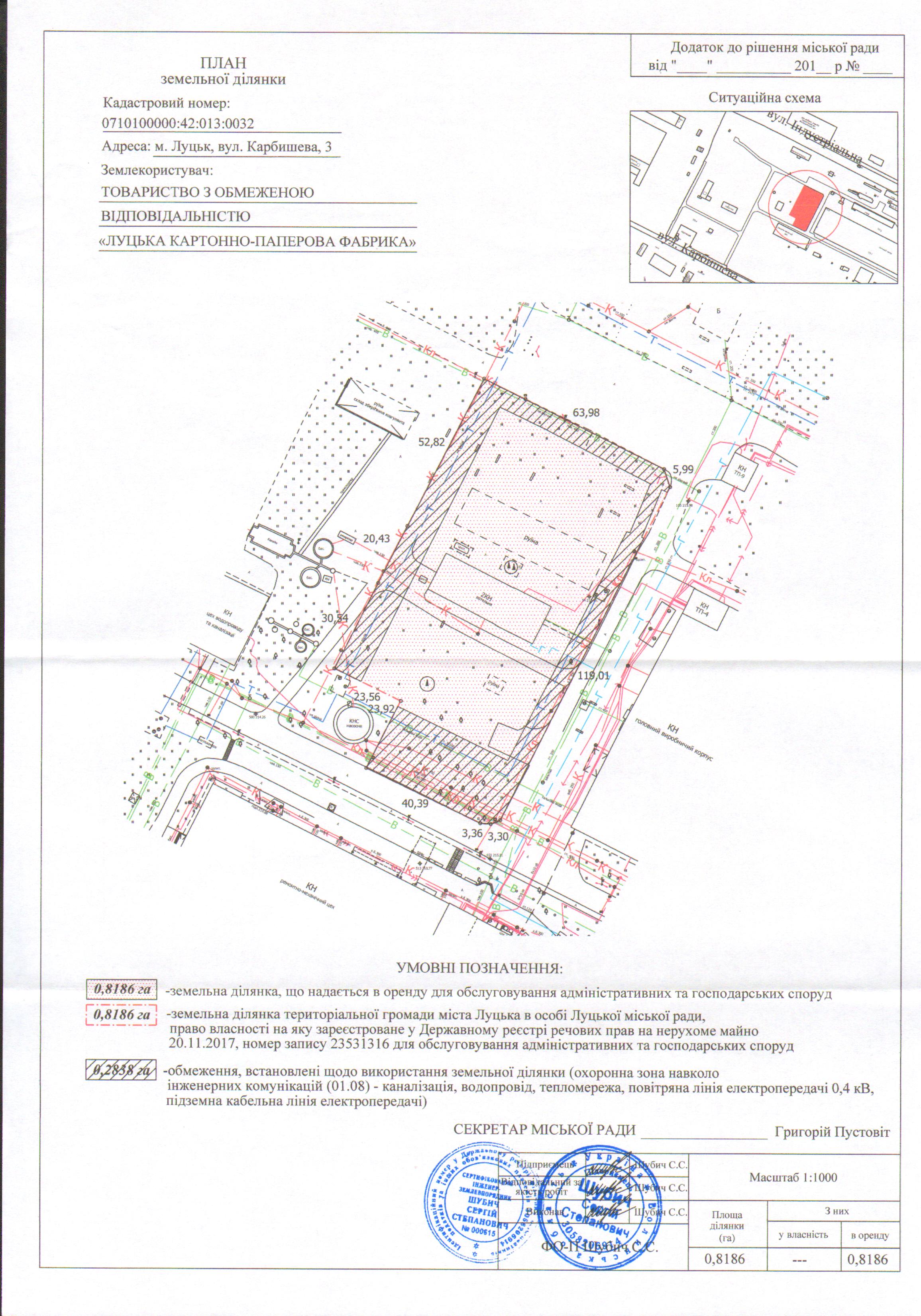 1. Надати ТОВАРИСТВУ З ОБМЕЖЕНОЮ ВІДПОВІДАЛЬНІСТЮ «ЛУЦЬКА КАРТОННО-ПАПЕРОВА ФАБРИКА» земельну ділянку на вул. Карбишева, 3, на умовах оренди строком на 10 років з дати укладення договору оренди землі, площею 0,8186 га, кадастровим номером 0710100000:42:013:0032, для обслуговування адміністративних та господарських споруд, згідно з додатком.