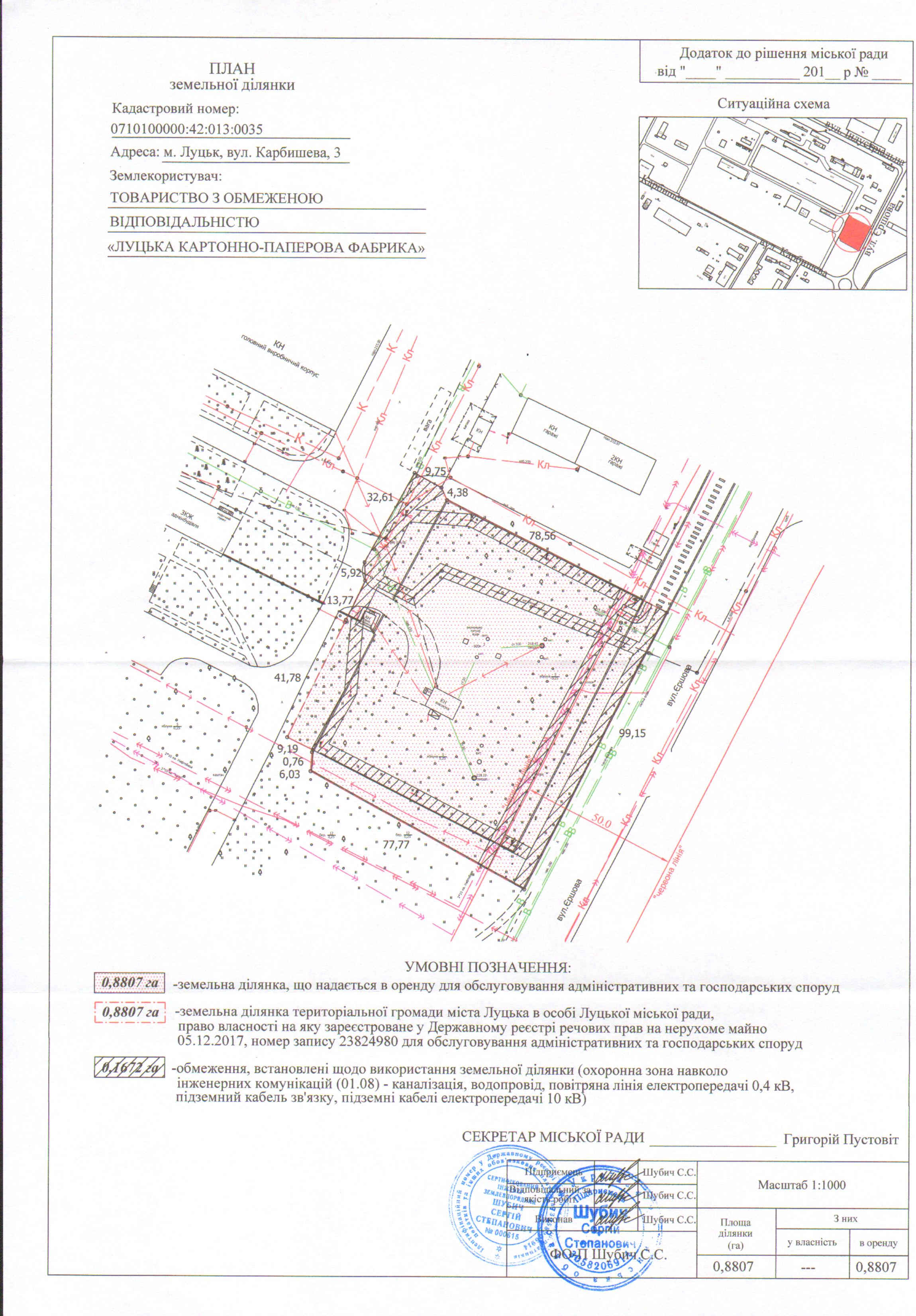 1. Надати ТОВАРИСТВУ З ОБМЕЖЕНОЮ ВІДПОВІДАЛЬНІСТЮ «ЛУЦЬКА КАРТОННО-ПАПЕРОВА ФАБРИКА» земельну ділянку на вул. Карбишева, 3, на умовах оренди строком на 10 років з дати укладення договору оренди землі, площею 0,8807 га, кадастровим номером 0710100000:42:013:0035, для обслуговування адміністративних та господарських споруд, згідно з додатком.