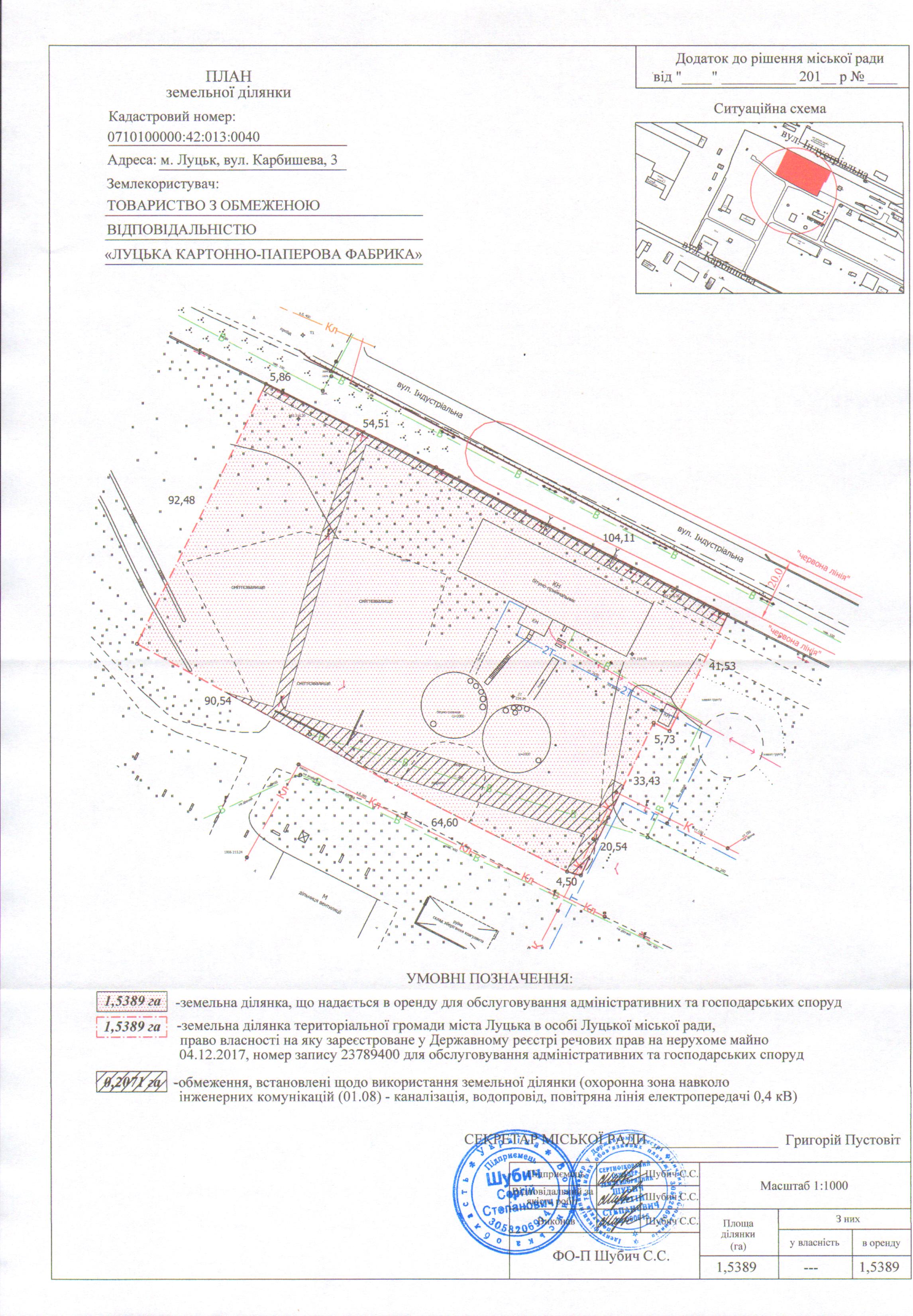 Розглянувши клопотання ТОВАРИСТВА З ОБМЕЖЕНОЮ ВІДПОВІДАЛЬНІСТЮ «ЛУЦЬКА КАРТОННО-ПАПЕРОВА ФАБРИКА» щодо надання на умовах оренди земельної ділянки на вул. Карбишева, 3 для обслуговування адміністративних та господарських споруд, витяг з Державного земельного кадастру про земельну ділянку від 02.11.2017 № НВ-0703502442017, витяг з Державного реєстру речових прав на нерухоме майно про реєстрацію права власності від 07.12.2017, індексний номер витягу: 106571636, відповідно до якого право власності Територіальної громади м. Луцька, від імені якої діє Луцька міська рада, на земельну ділянку площею 1,5389 га зареєстровано у Державному реєстрі речових прав на нерухоме майно від 04.12.2017, номер запису про право власності: 23789400, враховуючи правовстановлюючі документи ТОВАРИСТВА З ОБМЕЖЕНОЮ ВІДПОВІДАЛЬНІСТЮ «ЛУЦЬКА КАРТОННО-ПАПЕРОВА ФАБРИКА» на об'єкт нерухомого майна на вул. Карбишева, 3: свідоцтво від 18.12.2014 № 2083, відповідно до якого право власності на бітумосховище зареєстроване в Державному реєстрі речових прав на нерухоме майно 18.12.2014, номер запису про право власності: 8123543, технічний паспорт на об'єкт нерухомого майна від 31.01.2001, із внесеними змінами 07.05.2018, керуючись статтями 12, 79-1, 93, 96, 116, 123-126 Земельного кодексу України, частиною 2 статті 4, пунктом «в» статті 5, частиною 1, 5 статті 6, частиною 2 статті 16, статтею 17, частиною 1 статті 19 Закону України «Про оренду землі», статтею 4 Закону України «Про державну реєстрацію речових прав на нерухоме майно та їх обтяжень», Законом України «Про внесення змін до деяких законодавчих актів України щодо розмежування земель державної та комунальної власності», статтею 26 Закону України «Про місцеве самоврядування в Україні», міська рада