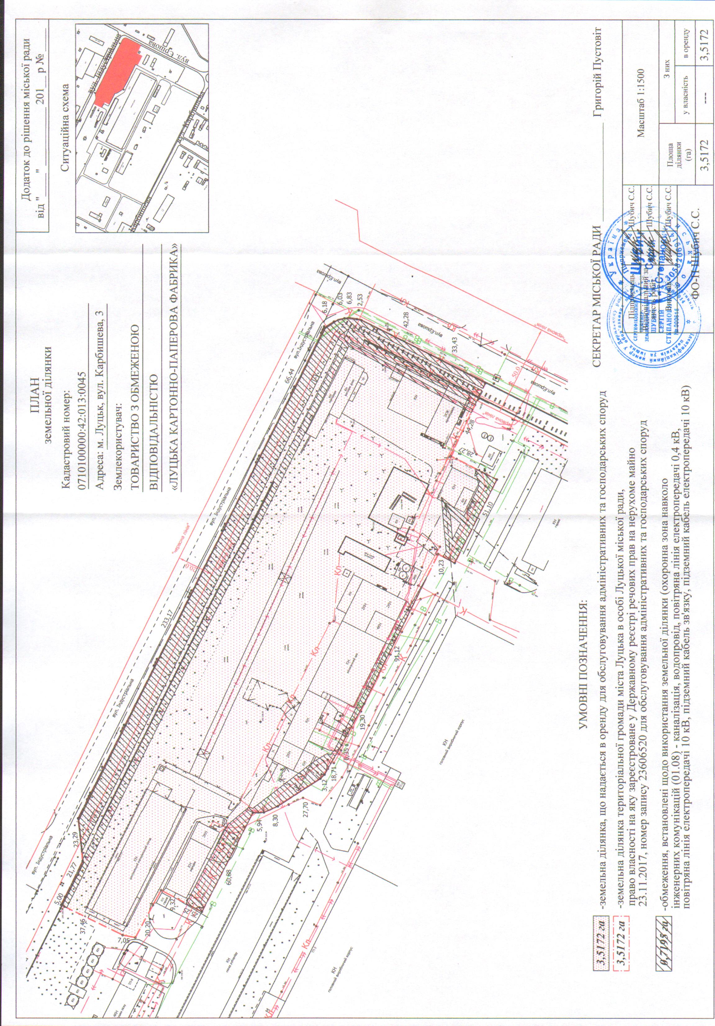 1. Надати ТОВАРИСТВУ З ОБМЕЖЕНОЮ ВІДПОВІДАЛЬНІСТЮ «ЛУЦЬКА КАРТОННО-ПАПЕРОВА ФАБРИКА» земельну ділянку на вул. Карбишева, 3, на умовах оренди строком на 10 років з дати укладення договору оренди землі, площею 3,5172 га, кадастровим номером 0710100000:42:013:0045, для обслуговування адміністративних та господарських споруд, згідно з додатком.