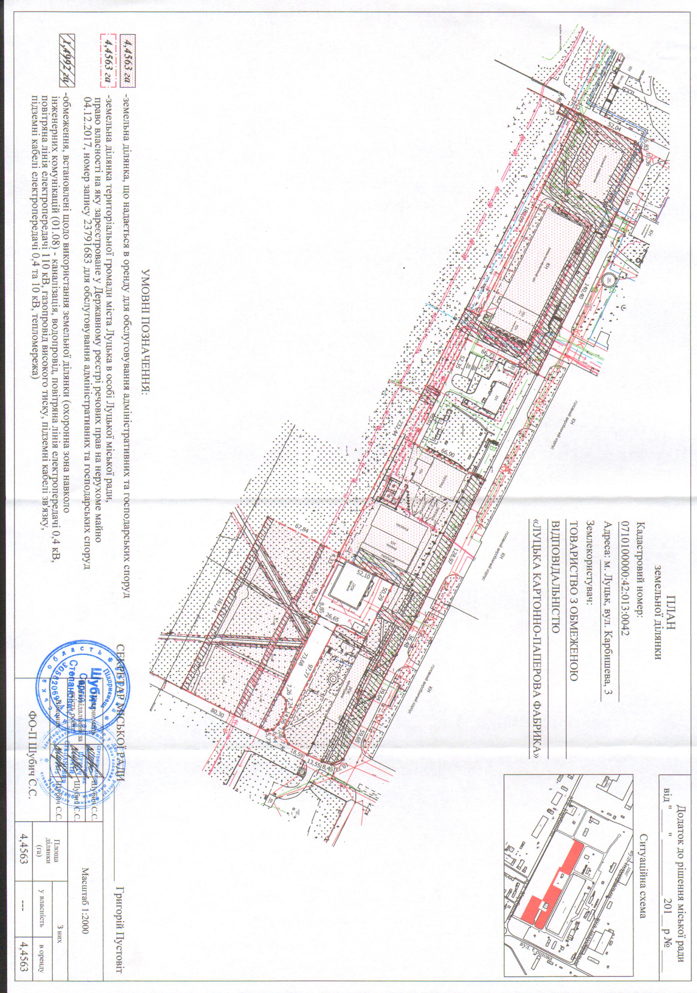 1. Надати ТОВАРИСТВУ З ОБМЕЖЕНОЮ ВІДПОВІДАЛЬНІСТЮ «ЛУЦЬКА КАРТОННО-ПАПЕРОВА ФАБРИКА» земельну ділянку на вул. Карбишева, 3, на умовах оренди строком на 10 років з дати укладення договору оренди землі, площею 4,4563 га, кадастровим номером 0710100000:42:013:0042, для обслуговування адміністративних та господарських споруд, згідно з додатком.