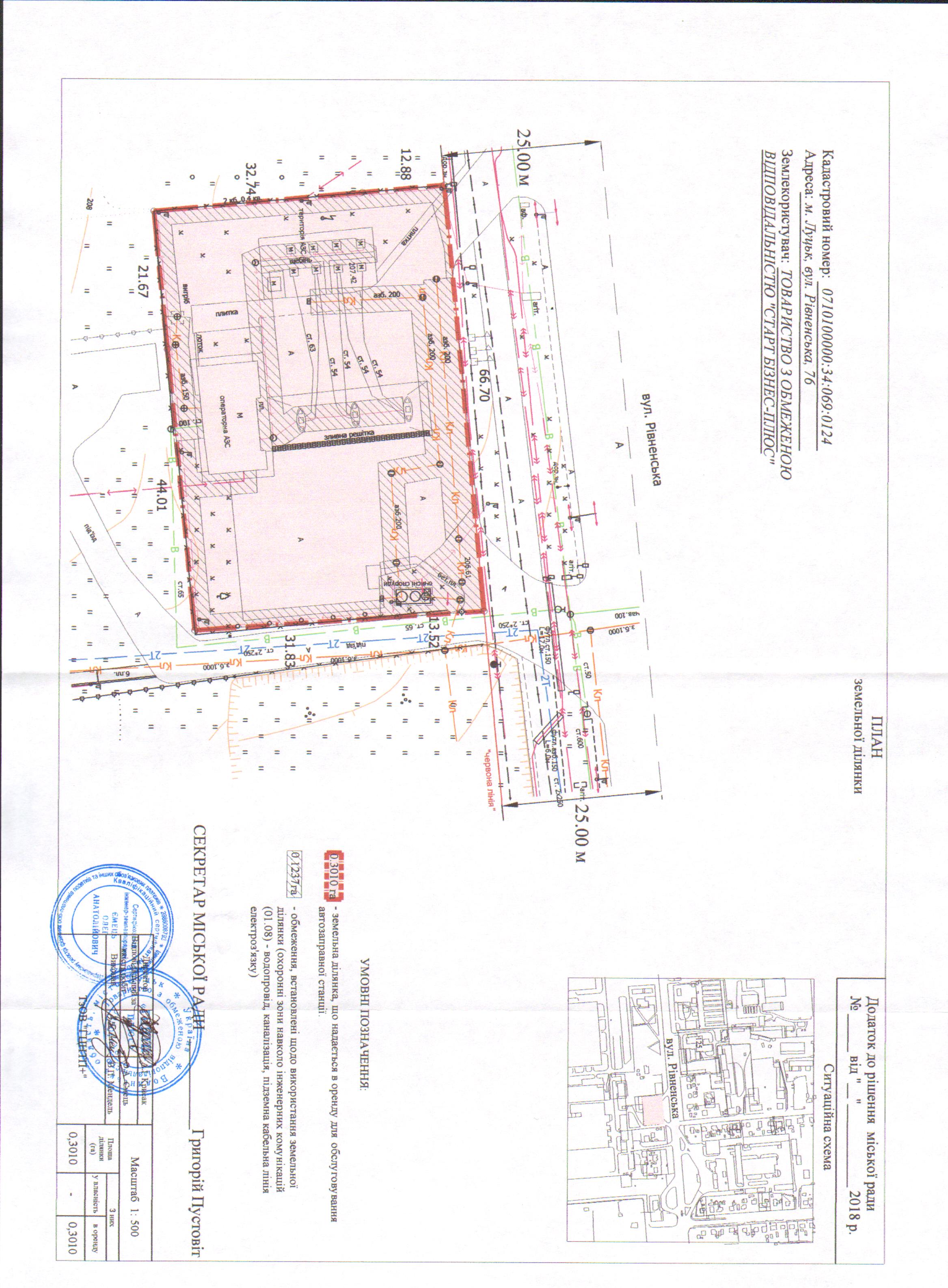1. Затвердити ТОВАРИСТВУ З ОБМЕЖЕНОЮ ВІДПОВІДАЛЬНІСТЮ «СТАРТ БІЗНЕС-ПЛЮС» технічну документацію із землеустрою щодо встановлення (відновлення) меж земельної ділянки в натурі (на місцевості) на вул. Рівненській, 76, площею 0,3010 га, кадастровим номером 0710100000:34:069:0124, для обслуговування автозаправної станції.