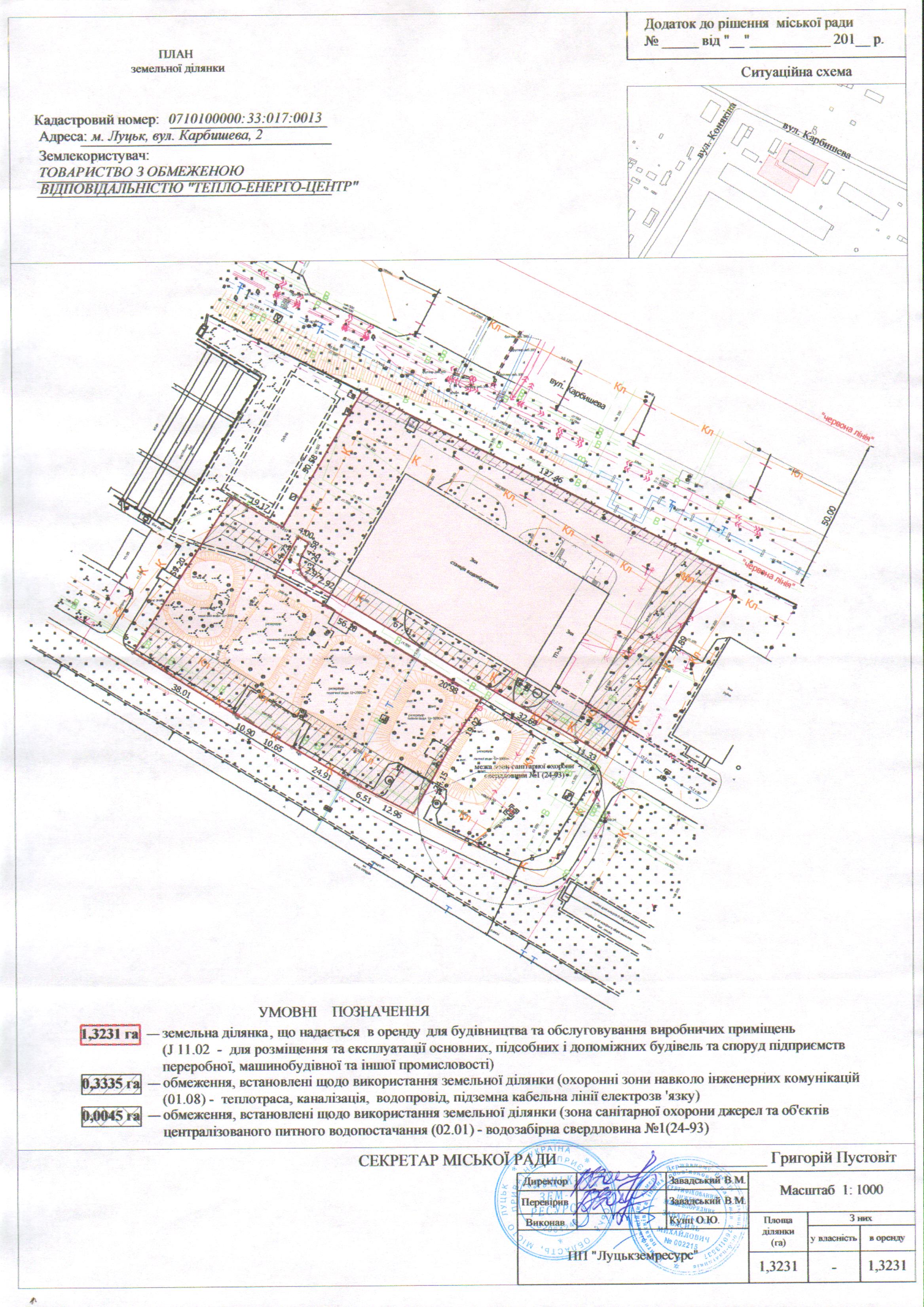 1. Затвердити ТОВАРИСТВУ З ОБМЕЖЕНОЮ ВІДПОВІДАЛЬНІСТЮ «ТЕПЛО-ЕНЕРГО-ЦЕНТР» проект землеустрою щодо відведення земельної ділянки на вул. Карбишева, 2 площею 1,3231 га, кадастровим номером 0710100000:33:017:0013, для будівництва та обслуговування виробничих приміщень (J 11.02 - для розміщення та експлуатації основних, підсобних і допоміжних будівель та споруд підприємств переробної, машинобудівної та іншої промисловості).