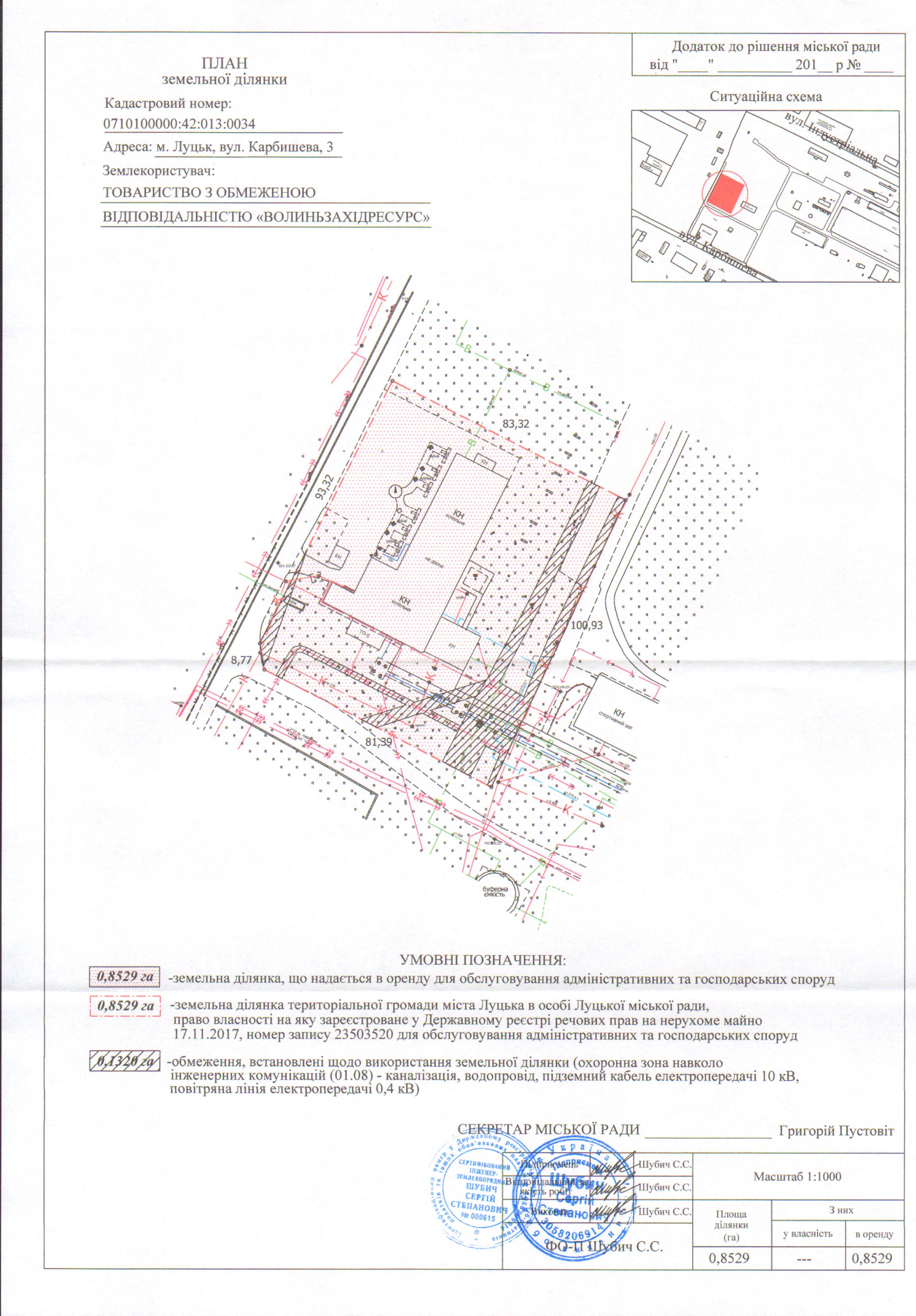 1. Надати ТОВАРИСТВУ З ОБМЕЖЕНОЮ ВІДПОВІДАЛЬНІСТЮ «ВОЛИНЬЗАХІДРЕСУРС» земельну ділянку на вул. Карбишева, 3, на умовах оренди строком на 10 років з дати укладення договору оренди землі, площею 0,8529 га, кадастровим номером 0710100000:42:013:0034, для обслуговування адміністративних та господарських споруд, згідно з додатком.