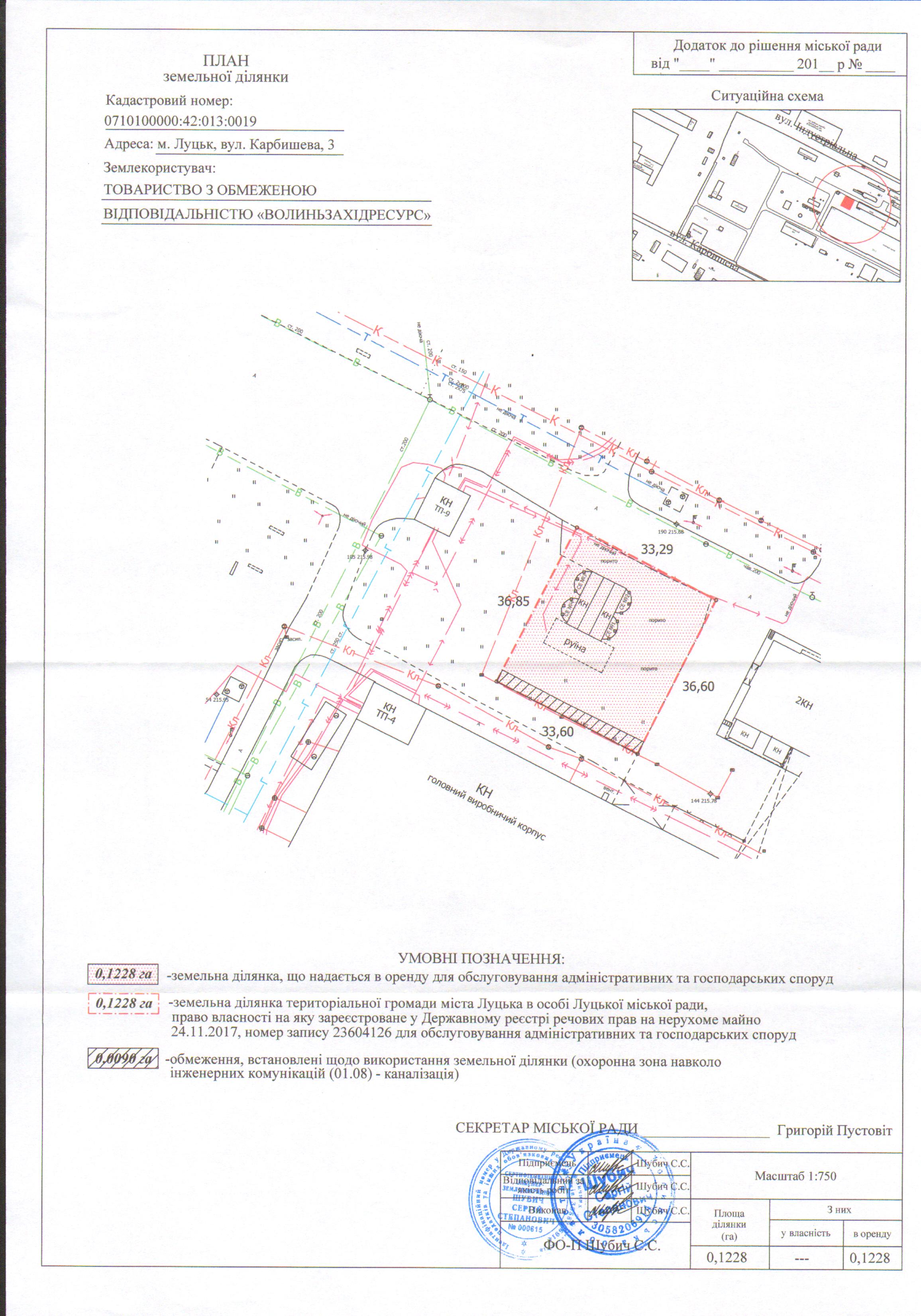 Розглянувши клопотання ТОВАРИСТВА З ОБМЕЖЕНОЮ ВІДПОВІДАЛЬНІСТЮ «ВОЛИНЬЗАХІДРЕСУРС» щодо надання на умовах оренди земельної ділянки на вул. Карбишева, 3 для обслуговування адміністративних та господарських споруд, витяг з Державного земельного кадастру про земельну ділянку від 02.11.2017 № НВ-0703502652017, витяг з Державного реєстру речових прав на нерухоме майно про реєстрацію права власності від 28.11.2017, індексний номер витягу: 105346787, відповідно до якого право власності Територіальної громади м. Луцька, від імені якої діє Луцька міська рада, на земельну ділянку площею 0,1228 га зареєстровано у Державному реєстрі речових прав на нерухоме майно від 24.11.2017, номер запису про право власності: 23604126, враховуючи правовстановлюючі документи ТОВАРИСТВА З ОБМЕЖЕНОЮ ВІДПОВІДАЛЬНІСТЮ «ВОЛИНЬЗАХІДРЕСУРС» на об'єкт нерухомого майна на вул. Карбишева, 3: свідоцтво від 17.12.2014 за № 2033, відповідно до якого право власності на склад тальку зареєстровано у Державному реєстрі речових прав на нерухоме майно 17.12.2014, номер запису про право власності: 8108636, технічний паспорт на об'єкт нерухомого майна від 20.12.2005, із внесеними змінами 07.05.2018, керуючись статтями 12, 79-1, 93, 96, 116, 123-126 Земельного кодексу України, частиною 2 статті 4, пунктом «в» статті 5, частиною 1, 5 статті 6, частиною 2 статті 16, статтею 17, частиною 1 статті 19 Закону України «Про оренду землі», статтею 4 Закону України «Про державну реєстрацію речових прав на нерухоме майно та їх обтяжень», Законом України «Про внесення змін до деяких законодавчих актів України щодо розмежування земель державної та комунальної власності», статтею 26 Закону України «Про місцеве самоврядування в Україні», міська рада