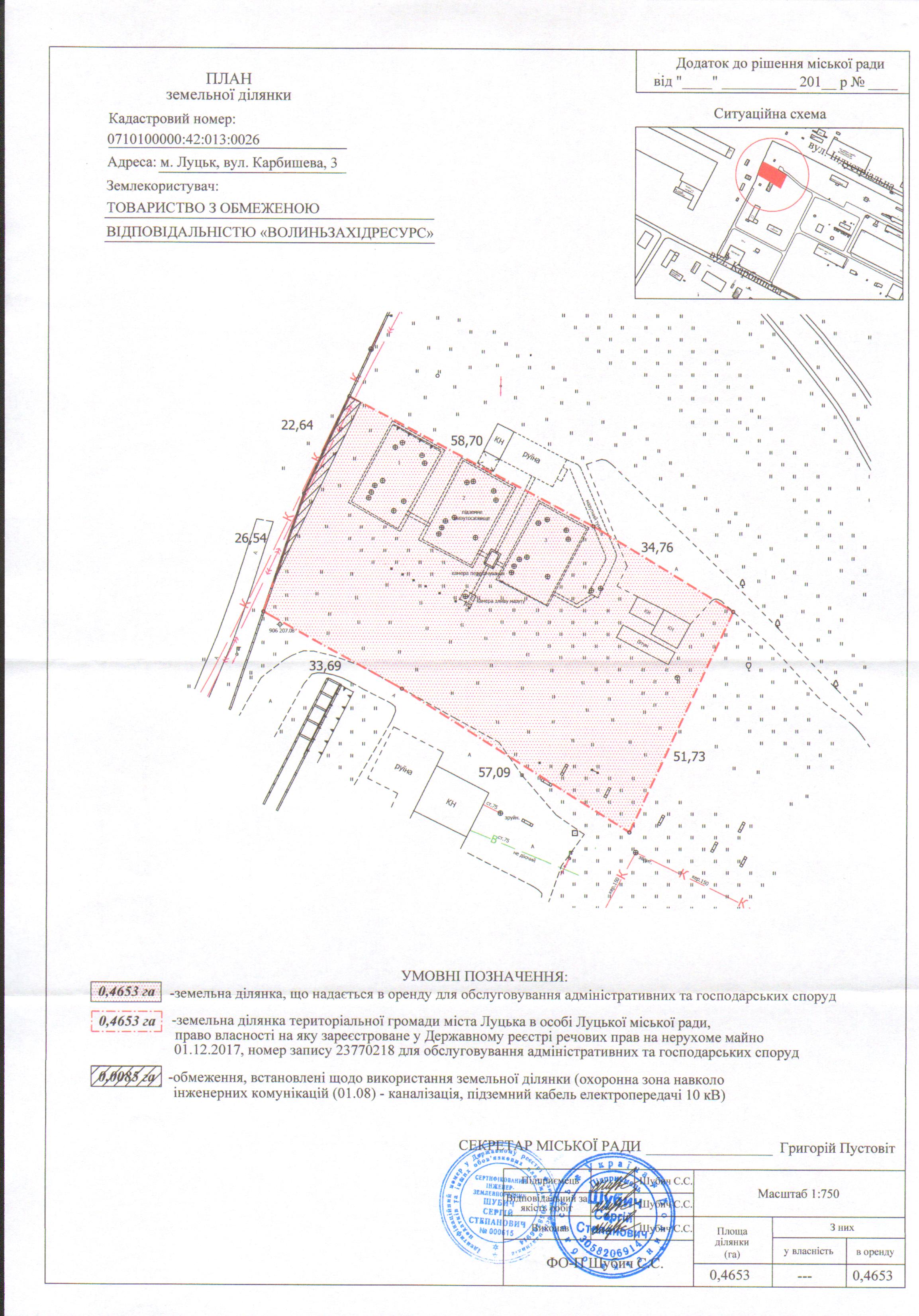 Розглянувши клопотання ТОВАРИСТВА З ОБМЕЖЕНОЮ ВІДПОВІДАЛЬНІСТЮ «ВОЛИНЬЗАХІДРЕСУРС» щодо надання на умовах оренди земельної ділянки на вул. Карбишева, 3 для обслуговування адміністративних та господарських споруд, витяг з Державного земельного кадастру про земельну ділянку від 02.11.2017 № НВ-0703502582017, витяг з Державного реєстру речових прав на нерухоме майно про реєстрацію права власності від 06.12.2017, індексний номер витягу: 106443082, відповідно до якого право власності Територіальної громади м. Луцька, від імені якої діє Луцька міська рада, на земельну ділянку площею 0,4653 га зареєстровано у Державному реєстрі речових прав на нерухоме майно від 01.12.2017, номер запису про право власності: 23770218, враховуючи правовстановлюючі документи ТОВАРИСТВА З ОБМЕЖЕНОЮ ВІДПОВІДАЛЬНІСТЮ «ВОЛИНЬЗАХІДРЕСУРС» на об'єкти нерухомого майна на вул. Карбишева, 3: свідоцтво від 17.12.2014 за № 2032, відповідно до якого право власності на мазутосховище зареєстровано у Державному реєстрі речових прав на нерухоме майно 17.12.2014, номер запису про право власності: 8108071, технічний паспорт на об'єкт нерухомого майна від 19.10.2005, із внесеними змінами 07.05.2018, керуючись статтями 12, 79-1, 93, 96, 116, 123-126 Земельного кодексу України, частиною 2 статті 4, пунктом «в» статті 5, частиною 1, 5 статті 6, частиною 2 статті 16, статтею 17, частиною 1 статті 19 Закону України «Про оренду землі», статтею 4 Закону України «Про державну реєстрацію речових прав на нерухоме майно та їх обтяжень», Законом України «Про внесення змін до деяких законодавчих актів України щодо розмежування земель державної та комунальної власності», статтею 26 Закону України «Про місцеве самоврядування в Україні», міська рада