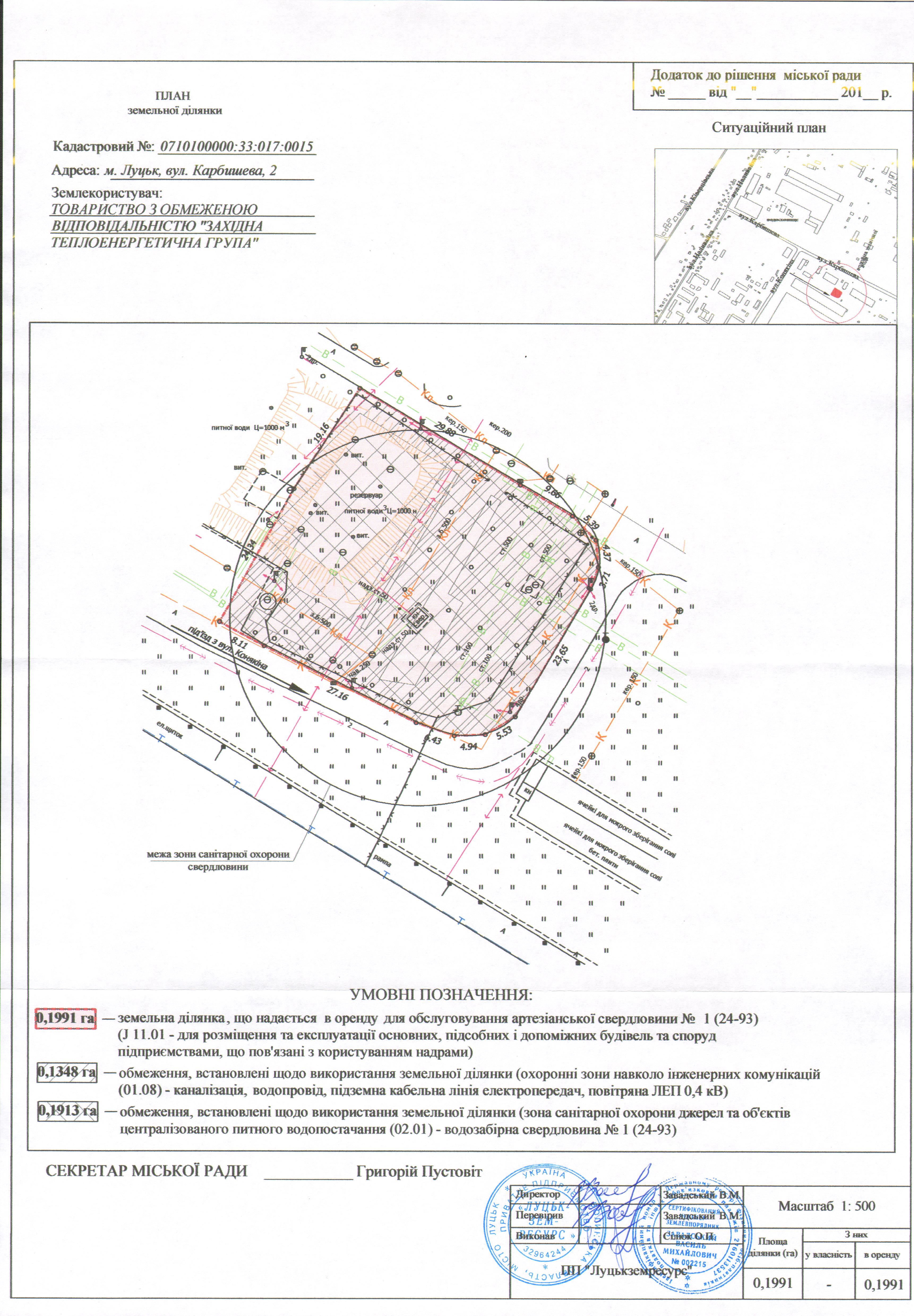 1. Затвердити ТОВАРИСТВУ З ОБМЕЖЕНОЮ ВІДПОВІДАЛЬНІСТЮ «ЗАХІДНА ТЕПЛОЕНЕРГЕТИЧНА ГРУПА» проект землеустрою щодо відведення земельної ділянки на вул. Карбишева, 2, площею 0,1991 га, кадастровим номером 0710100000:33:017:0015, для обслуговування артезіанської свердловини № 1 (24-93) (J 11.01 - для розміщення та експлуатації основних, підсобних і допоміжних будівель та споруд підприємствами, що пов’язані з користуванням надрами).
