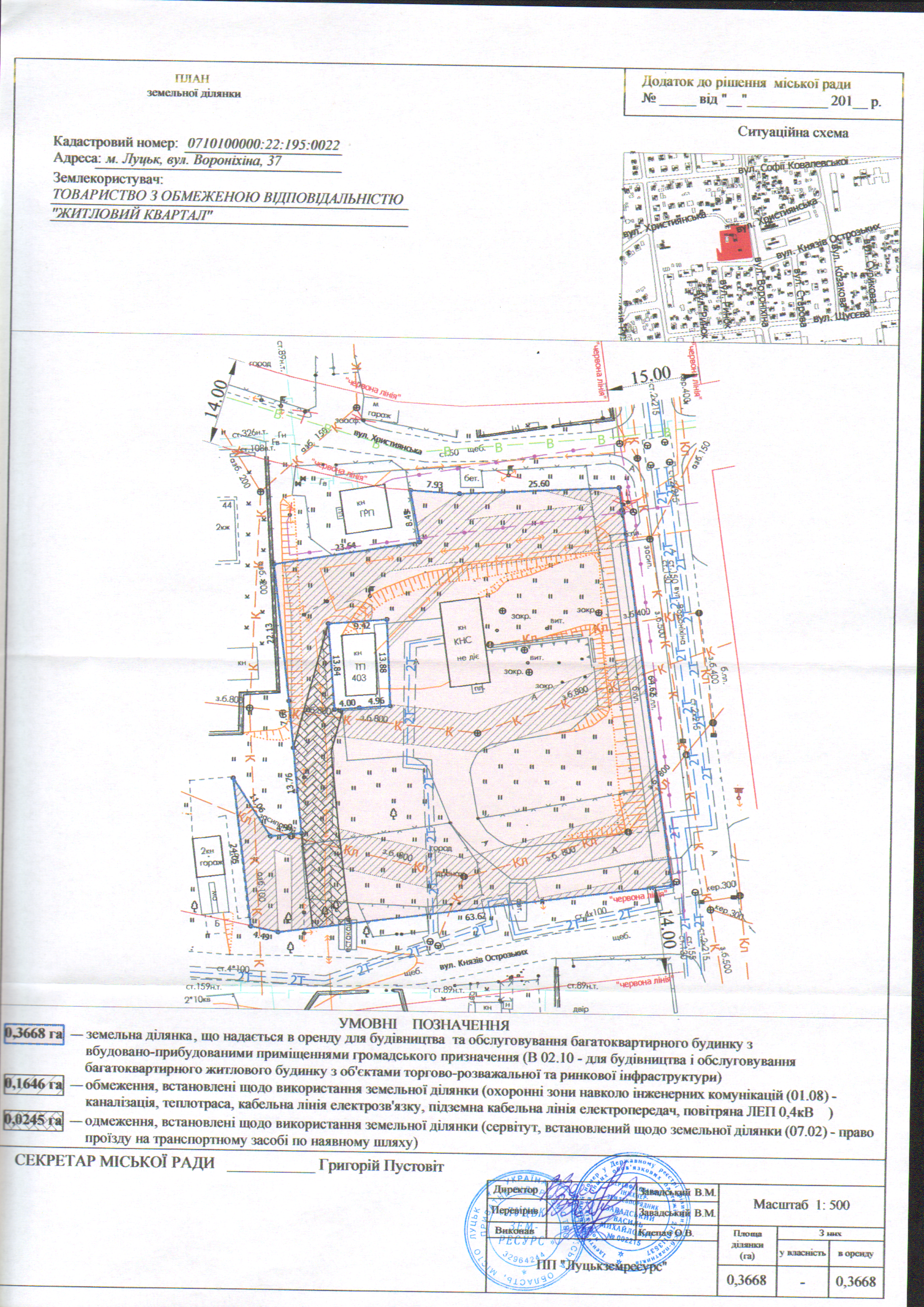 1. Затвердити ТОВАРИСТВУ З ОБМЕЖЕНОЮ ВІДПОВІДАЛЬНІСТЮ «ЖИТЛОВИЙ КВАРТАЛ» проект землеустрою щодо відведення земельної ділянки на вул. Вороніхіна, 37 площею 0,3668 га, кадастровим номером 0710100000:22:195:0022, для будівництва та обслуговування багатоквартирного будинку з вбудовано-прибудованими приміщеннями громадського призначення (В 02.10 - для будівництва і обслуговування багатоквартирного житлового будинку з об’єктами торгово-розважальної та ринкової інфраструктури).