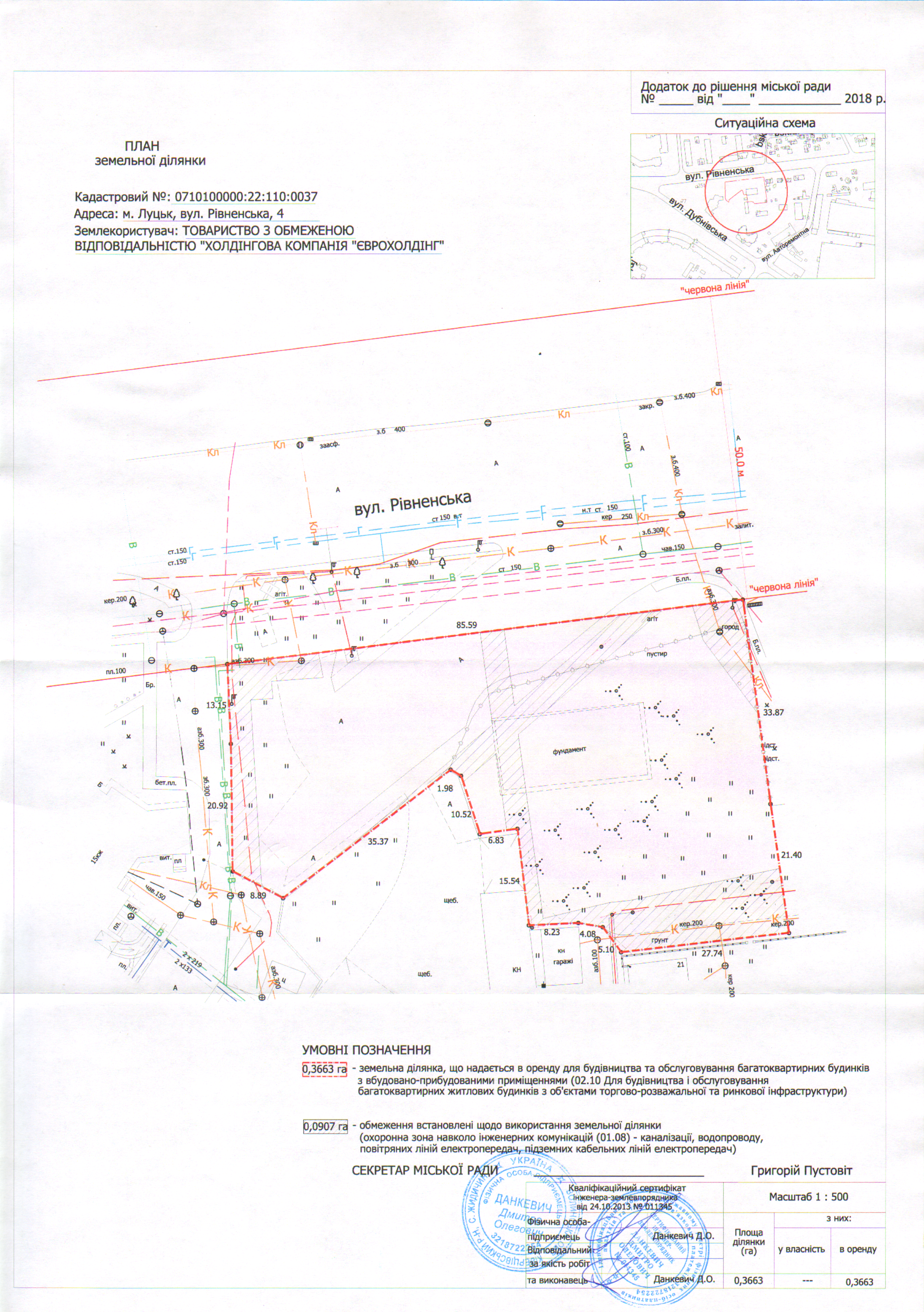 1. Затвердити ТОВАРИСТВУ З ОБМЕЖЕНОЮ ВІДПОВІДАЛЬНІСТЮ «ХОЛДІНГОВА КОМПАНІЯ «ЄВРОХОЛДІНГ» проект землеустрою щодо відведення земельної ділянки на вул. Рівненській, 4 площею 0,3663 га, кадастровим номером 0710100000:22:110:0037, для будівництва та обслуговування багатоквартирних будинків з вбудовано-прибудованими приміщеннями (02.10. Для будівництва і обслуговування багатоквартирного житлового будинку з об’єктами торгово-розважальної та ринкової інфраструктури).