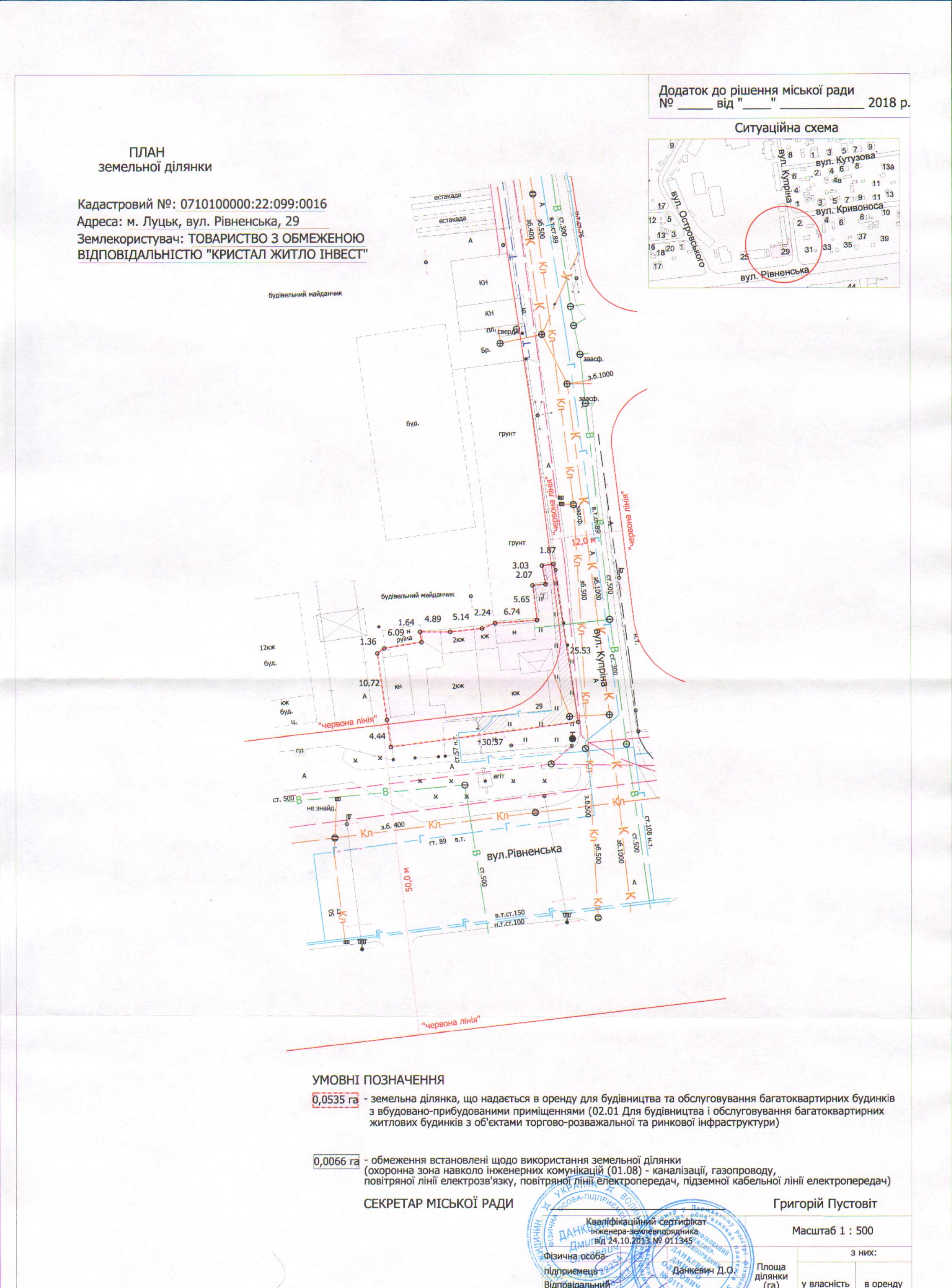 1. Затвердити ТОВАРИСТВУ З ОБМЕЖЕНОЮ ВІДПОВІДАЛЬНІСТЮ «КРИСТАЛ ЖИТЛО ІНВЕСТ» проект землеустрою щодо відведення земельної ділянки на вул. Рівненській, 29 площею 0,0535 га, кадастровим номером 0710100000:22:099:0016, для будівництва та обслуговування багатоквартирних будинків з вбудовано-прибудованими приміщеннями (02.10. Для будівництва і обслуговування багатоквартирного житлового будинку з об’єктами торгово-розважальної та ринкової інфраструктури).