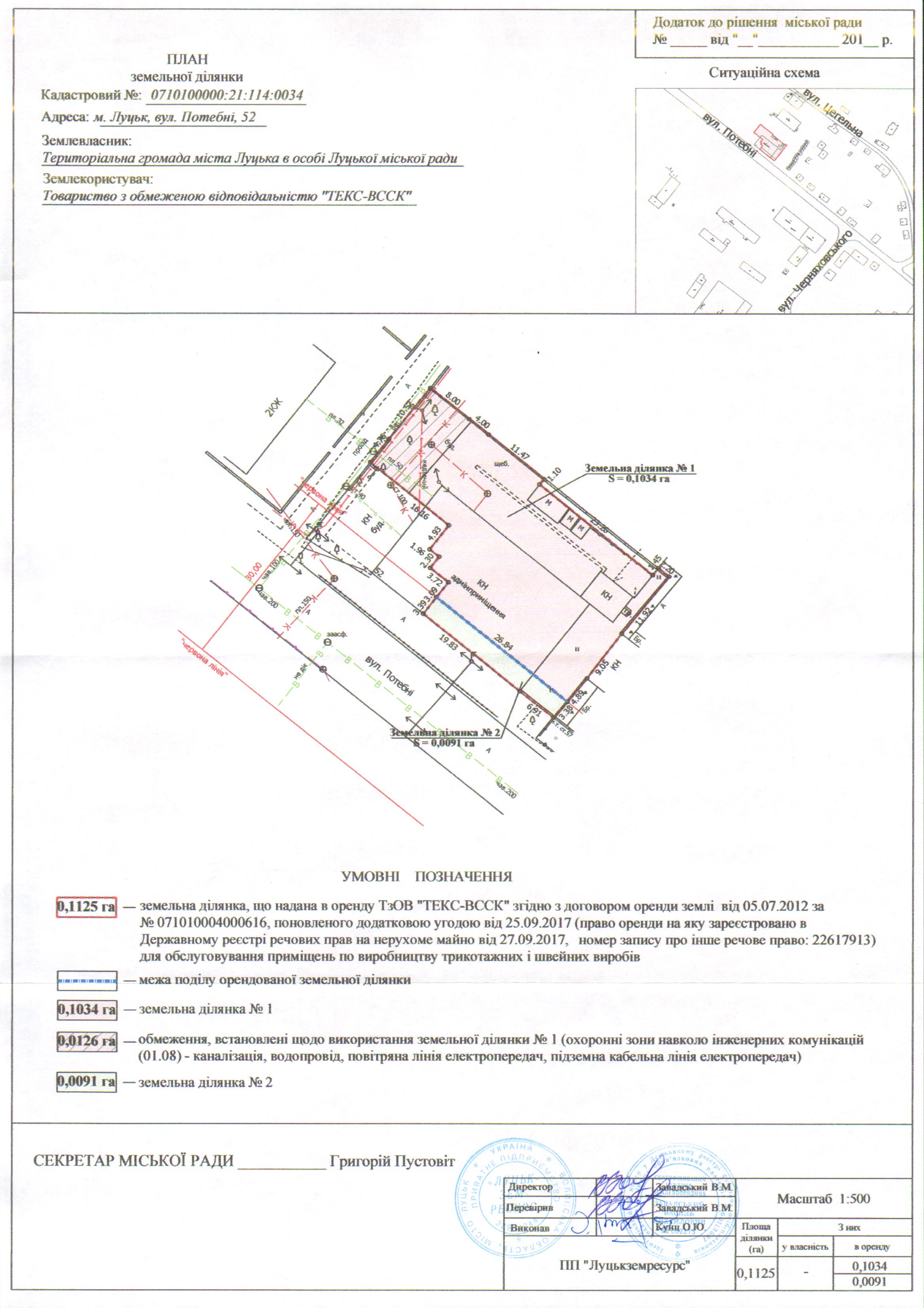 Про надання ТзОВ «ТЕКС-ВССК» згоди на поділ орендованої земельної ділянки на вул. Потебні, 52 (загальною площею 0,1125 га: земельна ділянка 1 – площею 0,1034 га, земельна ділянка 2 – площею 0,0091 га)